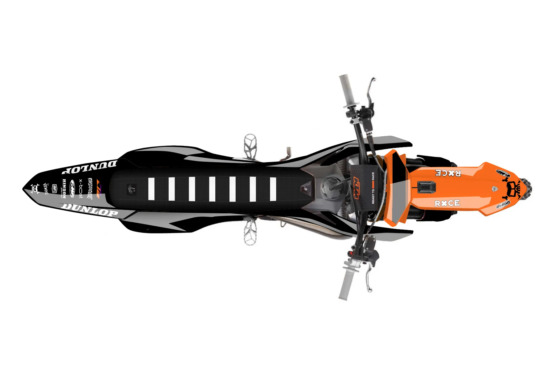 «ktm 1» — готовый комплект графики серии Untucked для KTM MX Graphic Kit KTM SX-F 250 2025. В комплекте: графика на бак и боковые облицовки, крылья (переднее и заднее), передний щиток, номерные таблички, защита вилки. Материал: ПВХ-винил 80 мкр с холодной ламинацией 300 мкр, общая толщина 380 мкр; покрытие глянцевое или матовое на выбор. Устойчив к UV-излучению, воде, бензину и мойке высокого давления. Клей акриловый на сольвентной основе — постоянный, для гибких пластиков. На простых поверхностях монтируется без нагрева; для сложных изгибов рекомендуем фен. Этот пресет можно заказать как есть или взять за основу в конструкторе: поменять цвета, добавить стартовый номер и свой бренд. Производство — 3–5 рабочих дней, доставка по России СДЭКом или Почтой, по СНГ — курьерскими службами.