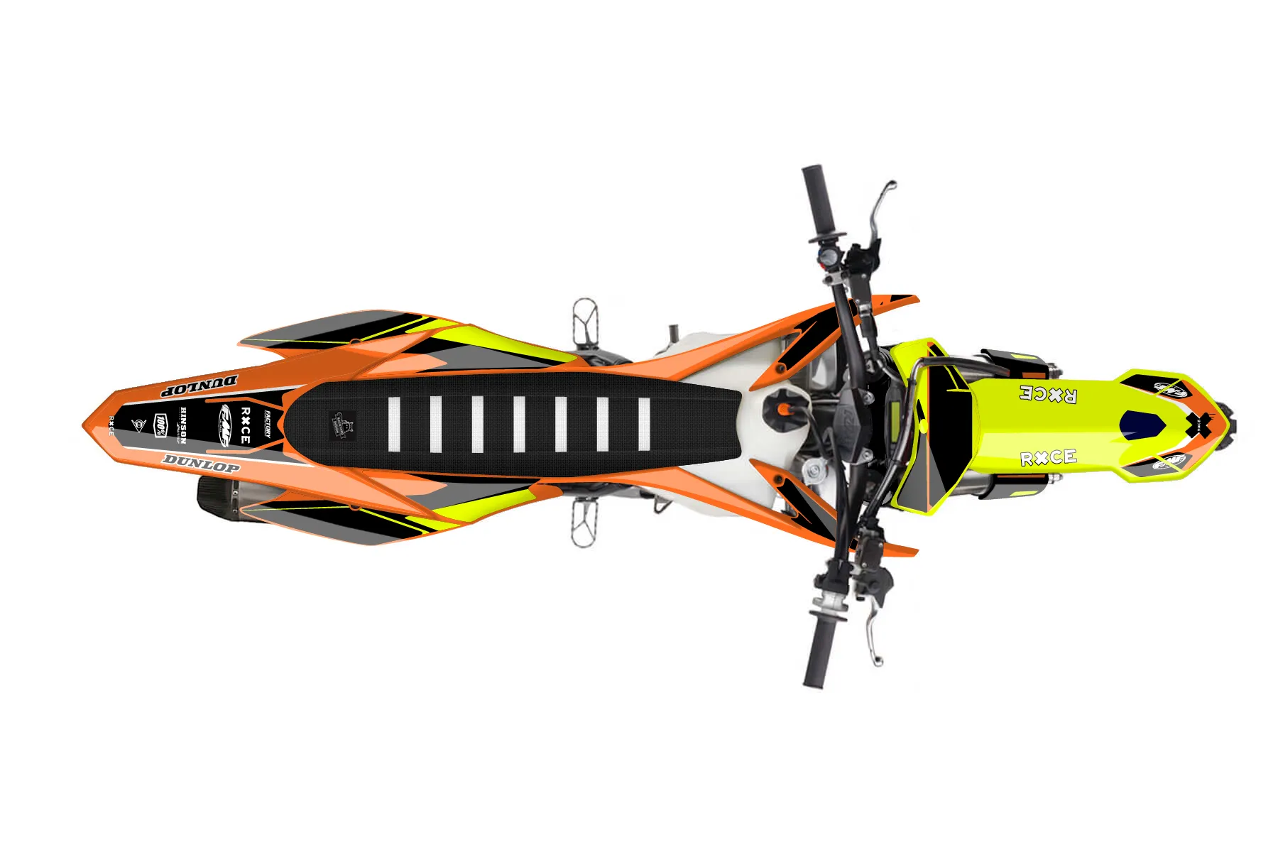 «Fluorescent» — готовый комплект графики серии Flow для KTM MX Graphic Kit KTM SX-F 350 2013. В комплекте: графика на бак и боковые облицовки, крылья (переднее и заднее), передний щиток, номерные таблички, защита вилки. Материал: ПВХ-винил 80 мкр с холодной ламинацией 300 мкр, общая толщина 380 мкр; покрытие глянцевое или матовое на выбор. Устойчив к UV-излучению, воде, бензину и мойке высокого давления. Клей акриловый на сольвентной основе — постоянный, для гибких пластиков. На простых поверхностях монтируется без нагрева; для сложных изгибов рекомендуем фен. Этот пресет можно заказать как есть или взять за основу в конструкторе: поменять цвета, добавить стартовый номер и свой бренд. Производство — 3–5 рабочих дней, доставка по России СДЭКом или Почтой, по СНГ — курьерскими службами.