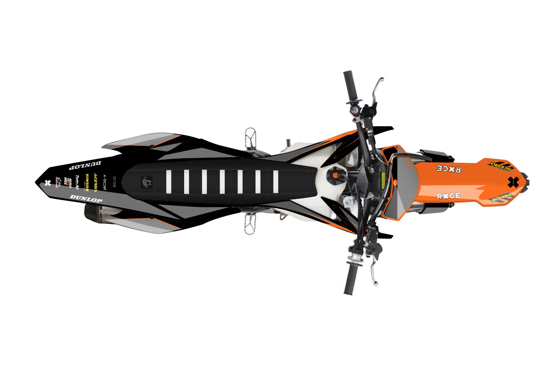 «Loose» — готовый комплект графики серии Maverick для KTM MX Graphic Kit KTM SX-F 350 2013. В комплекте: графика на бак и боковые облицовки, крылья (переднее и заднее), передний щиток, номерные таблички, защита вилки. Материал: ПВХ-винил 80 мкр с холодной ламинацией 300 мкр, общая толщина 380 мкр; покрытие глянцевое или матовое на выбор. Устойчив к UV-излучению, воде, бензину и мойке высокого давления. Клей акриловый на сольвентной основе — постоянный, для гибких пластиков. На простых поверхностях монтируется без нагрева; для сложных изгибов рекомендуем фен. Этот пресет можно заказать как есть или взять за основу в конструкторе: поменять цвета, добавить стартовый номер и свой бренд. Производство — 3–5 рабочих дней, доставка по России СДЭКом или Почтой, по СНГ — курьерскими службами.