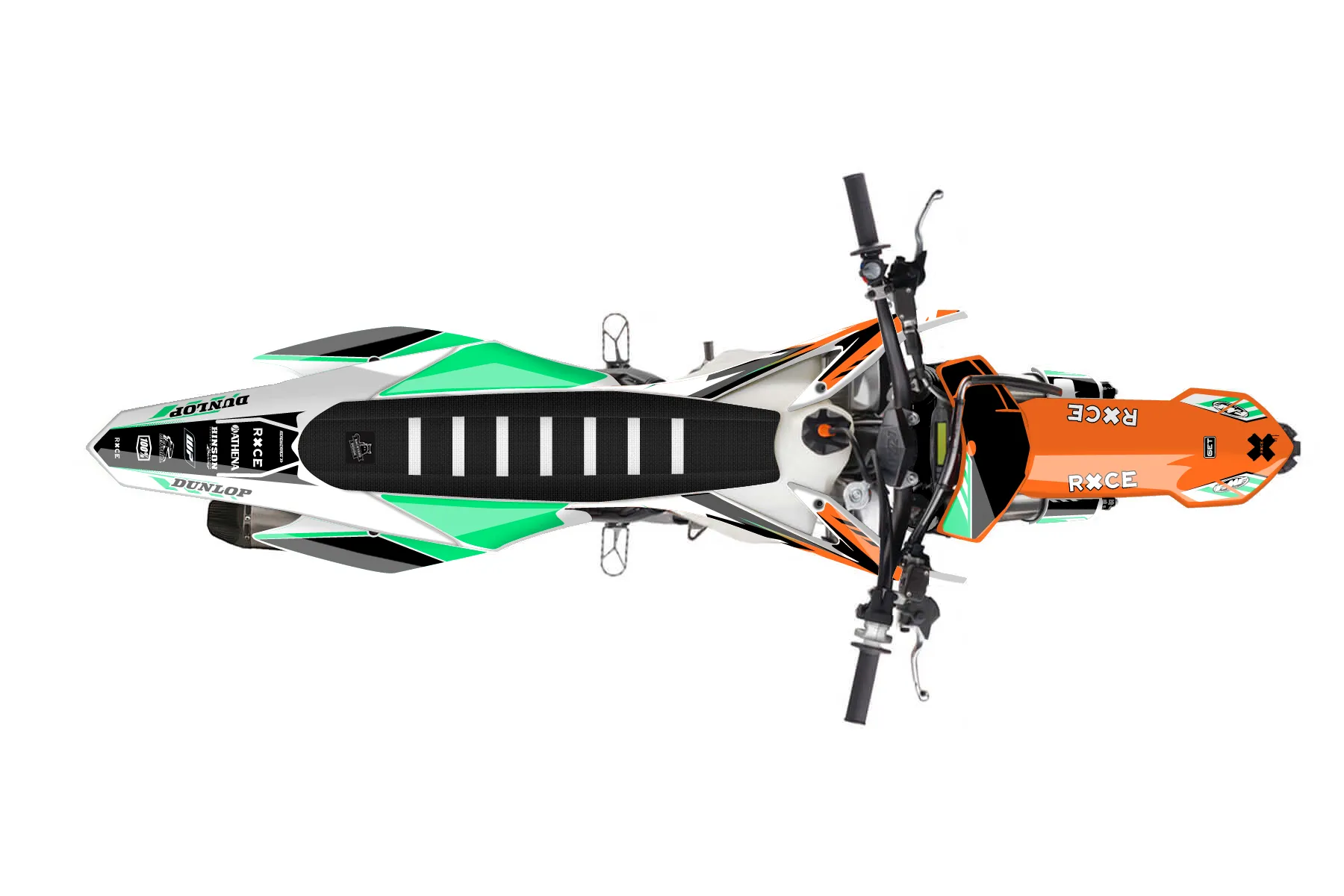 «Future» — готовый комплект графики серии Maverick для KTM MX Graphic Kit KTM SX-F 350 2015. В комплекте: графика на бак и боковые облицовки, крылья (переднее и заднее), передний щиток, номерные таблички, защита вилки. Материал: ПВХ-винил 80 мкр с холодной ламинацией 300 мкр, общая толщина 380 мкр; покрытие глянцевое или матовое на выбор. Устойчив к UV-излучению, воде, бензину и мойке высокого давления. Клей акриловый на сольвентной основе — постоянный, для гибких пластиков. На простых поверхностях монтируется без нагрева; для сложных изгибов рекомендуем фен. Этот пресет можно заказать как есть или взять за основу в конструкторе: поменять цвета, добавить стартовый номер и свой бренд. Производство — 3–5 рабочих дней, доставка по России СДЭКом или Почтой, по СНГ — курьерскими службами.