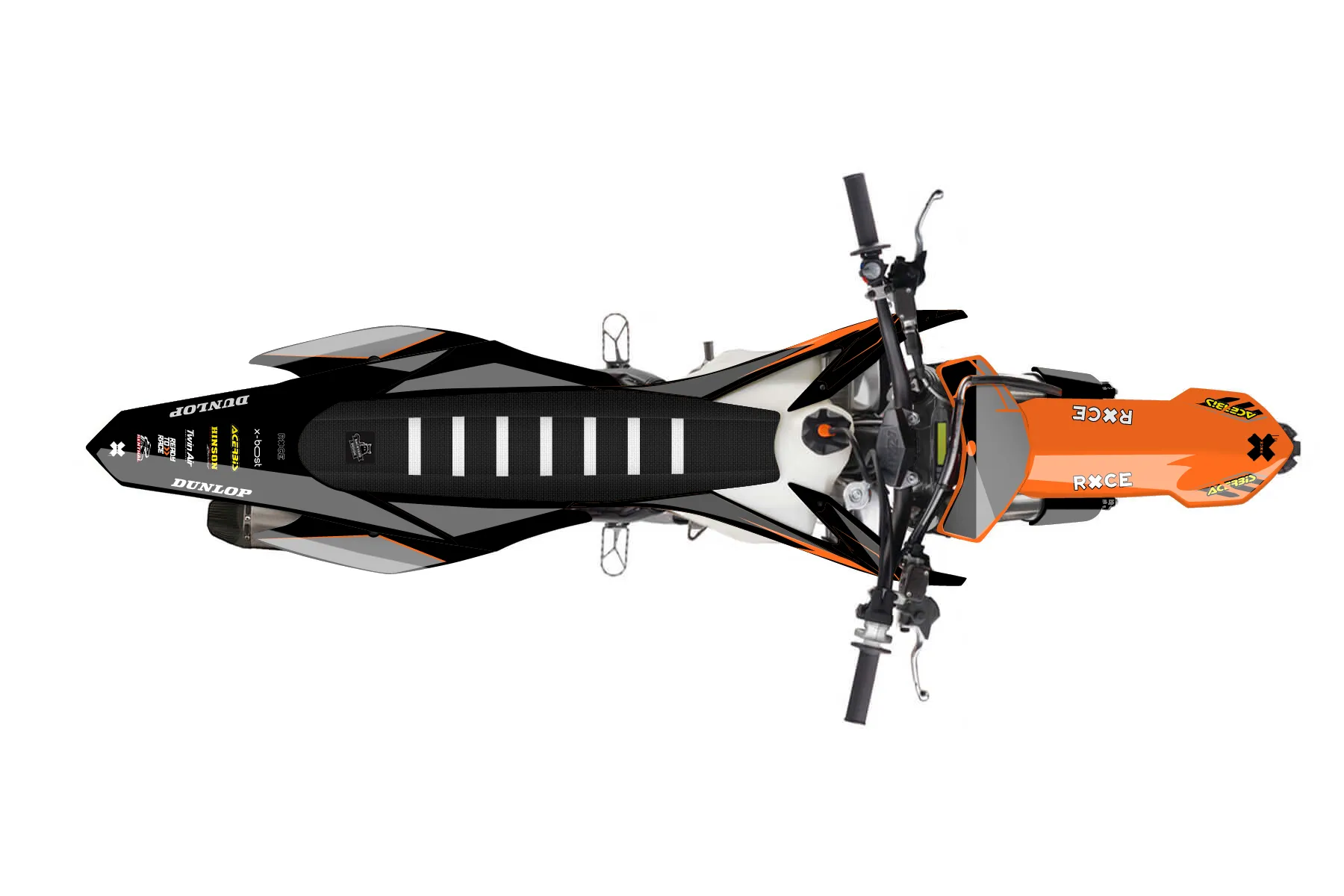 «Loose» — готовый комплект графики серии Maverick для KTM MX Graphic Kit KTM SX-F 350 2015. В комплекте: графика на бак и боковые облицовки, крылья (переднее и заднее), передний щиток, номерные таблички, защита вилки. Материал: ПВХ-винил 80 мкр с холодной ламинацией 300 мкр, общая толщина 380 мкр; покрытие глянцевое или матовое на выбор. Устойчив к UV-излучению, воде, бензину и мойке высокого давления. Клей акриловый на сольвентной основе — постоянный, для гибких пластиков. На простых поверхностях монтируется без нагрева; для сложных изгибов рекомендуем фен. Этот пресет можно заказать как есть или взять за основу в конструкторе: поменять цвета, добавить стартовый номер и свой бренд. Производство — 3–5 рабочих дней, доставка по России СДЭКом или Почтой, по СНГ — курьерскими службами.