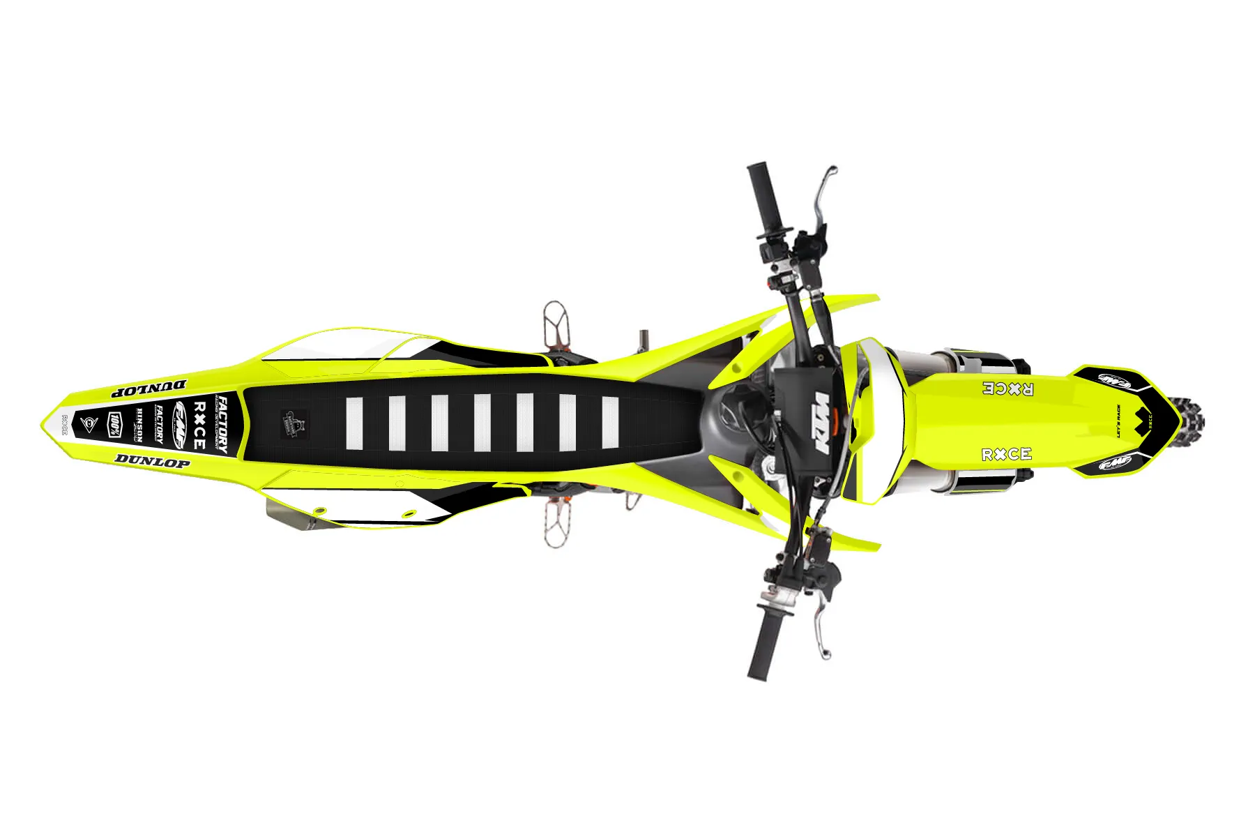 «Bright Neon» — готовый комплект графики серии Maverick для KTM MX Graphic Kit KTM SX-F 350 2016. В комплекте: графика на бак и боковые облицовки, крылья (переднее и заднее), передний щиток, номерные таблички, защита вилки. Материал: ПВХ-винил 80 мкр с холодной ламинацией 300 мкр, общая толщина 380 мкр; покрытие глянцевое или матовое на выбор. Устойчив к UV-излучению, воде, бензину и мойке высокого давления. Клей акриловый на сольвентной основе — постоянный, для гибких пластиков. На простых поверхностях монтируется без нагрева; для сложных изгибов рекомендуем фен. Этот пресет можно заказать как есть или взять за основу в конструкторе: поменять цвета, добавить стартовый номер и свой бренд. Производство — 3–5 рабочих дней, доставка по России СДЭКом или Почтой, по СНГ — курьерскими службами.