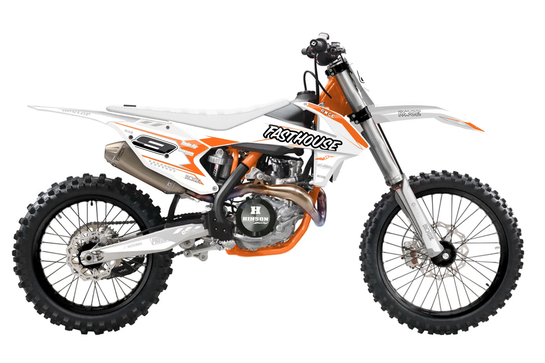«KTM FASTHOUSE» — готовый комплект графики серии Maverick для KTM MX Graphic Kit KTM SX-F 350 2016. В комплекте: графика на бак и боковые облицовки, крылья (переднее и заднее), передний щиток, номерные таблички, защита вилки. Материал: ПВХ-винил 80 мкр с холодной ламинацией 300 мкр, общая толщина 380 мкр; покрытие глянцевое или матовое на выбор. Устойчив к UV-излучению, воде, бензину и мойке высокого давления. Клей акриловый на сольвентной основе — постоянный, для гибких пластиков. На простых поверхностях монтируется без нагрева; для сложных изгибов рекомендуем фен. Этот пресет можно заказать как есть или взять за основу в конструкторе: поменять цвета, добавить стартовый номер и свой бренд. Производство — 3–5 рабочих дней, доставка по России СДЭКом или Почтой, по СНГ — курьерскими службами.
