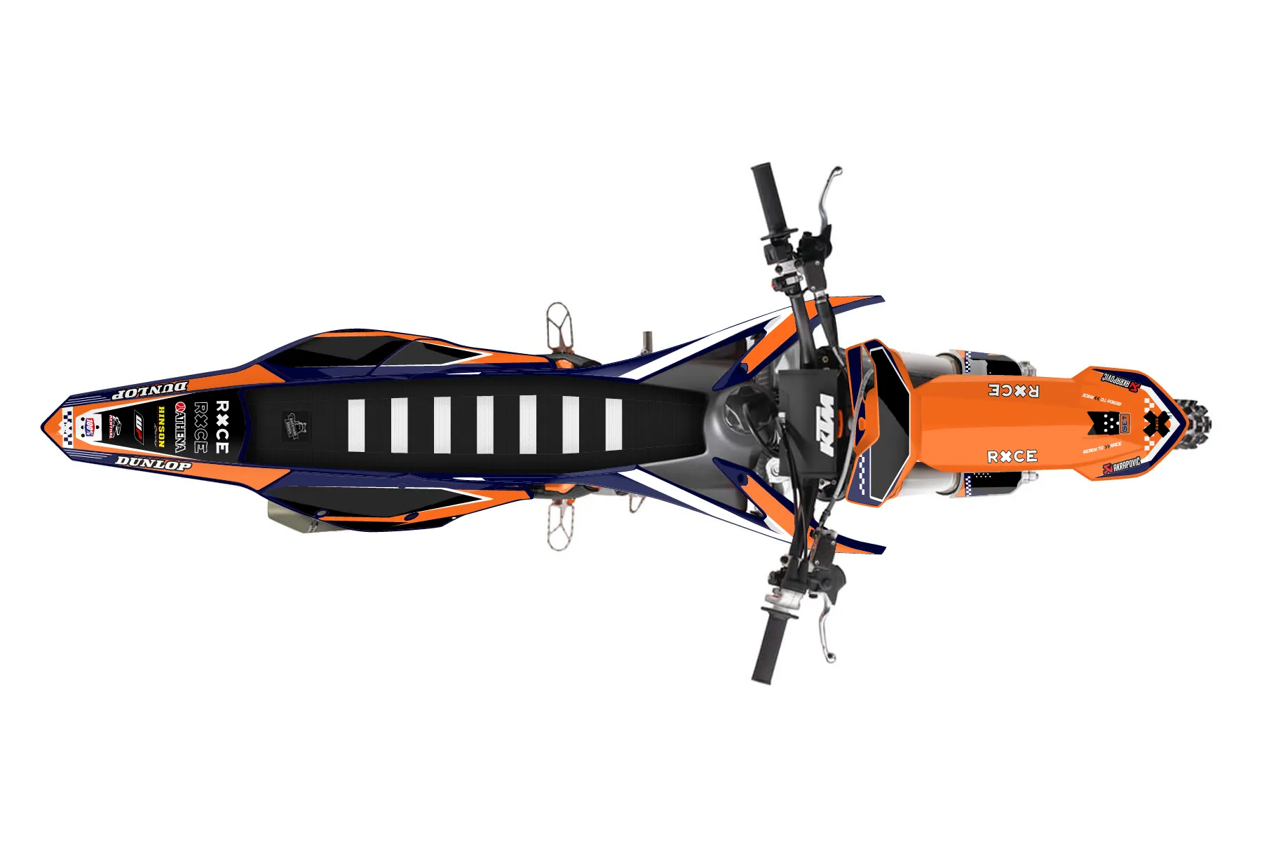 «Rage» — готовый комплект графики серии Staple для KTM MX Graphic Kit KTM SX-F 350 2016. В комплекте: графика на бак и боковые облицовки, крылья (переднее и заднее), передний щиток, номерные таблички, защита вилки. Материал: ПВХ-винил 80 мкр с холодной ламинацией 300 мкр, общая толщина 380 мкр; покрытие глянцевое или матовое на выбор. Устойчив к UV-излучению, воде, бензину и мойке высокого давления. Клей акриловый на сольвентной основе — постоянный, для гибких пластиков. На простых поверхностях монтируется без нагрева; для сложных изгибов рекомендуем фен. Этот пресет можно заказать как есть или взять за основу в конструкторе: поменять цвета, добавить стартовый номер и свой бренд. Производство — 3–5 рабочих дней, доставка по России СДЭКом или Почтой, по СНГ — курьерскими службами.