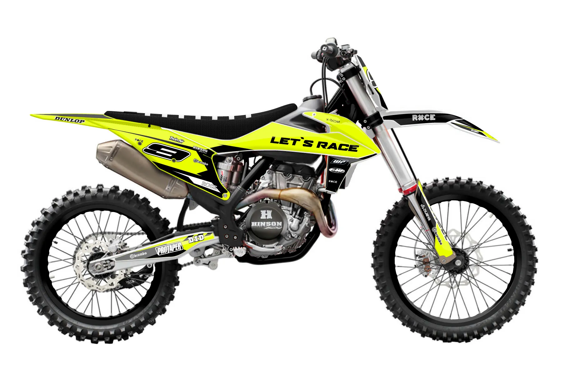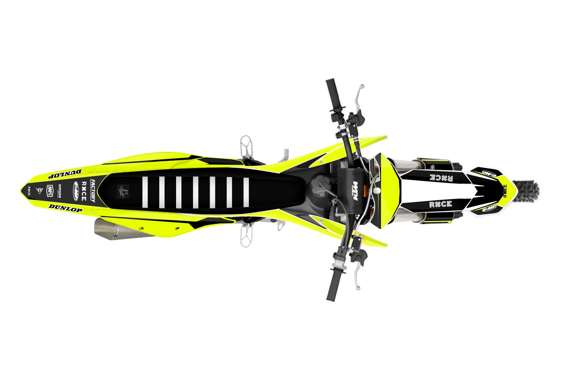 «Ryder Neon» — готовый комплект графики серии Maverick для KTM MX Graphic Kit KTM SX-F 350 2019. В комплекте: графика на бак и боковые облицовки, крылья (переднее и заднее), передний щиток, номерные таблички, защита вилки. Материал: ПВХ-винил 80 мкр с холодной ламинацией 300 мкр, общая толщина 380 мкр; покрытие глянцевое или матовое на выбор. Устойчив к UV-излучению, воде, бензину и мойке высокого давления. Клей акриловый на сольвентной основе — постоянный, для гибких пластиков. На простых поверхностях монтируется без нагрева; для сложных изгибов рекомендуем фен. Этот пресет можно заказать как есть или взять за основу в конструкторе: поменять цвета, добавить стартовый номер и свой бренд. Производство — 3–5 рабочих дней, доставка по России СДЭКом или Почтой, по СНГ — курьерскими службами.