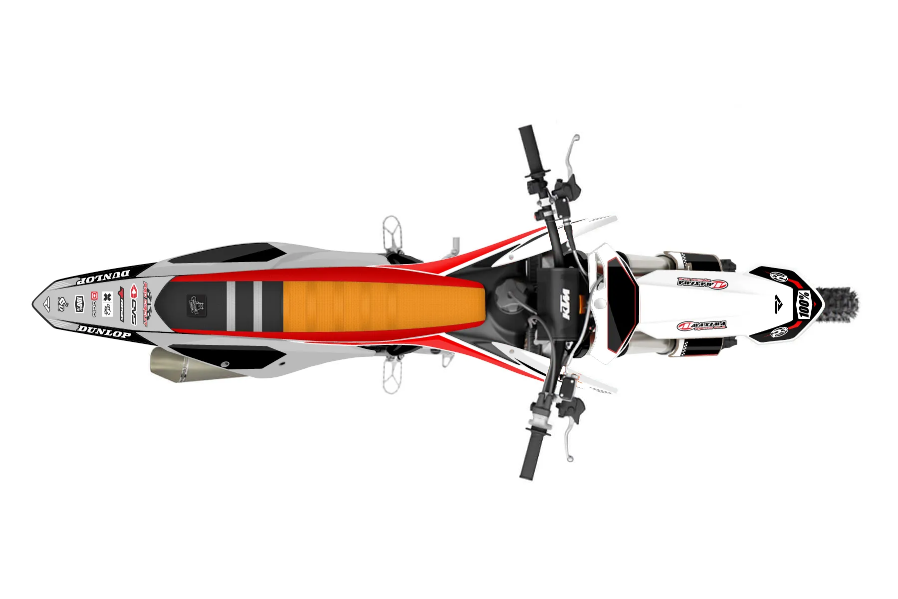 «CustomDesign1» — готовый комплект графики серии Staple для KTM MX Graphic Kit KTM SX-F 350 2019. В комплекте: графика на бак и боковые облицовки, крылья (переднее и заднее), передний щиток, номерные таблички, защита вилки. Материал: ПВХ-винил 80 мкр с холодной ламинацией 300 мкр, общая толщина 380 мкр; покрытие глянцевое или матовое на выбор. Устойчив к UV-излучению, воде, бензину и мойке высокого давления. Клей акриловый на сольвентной основе — постоянный, для гибких пластиков. На простых поверхностях монтируется без нагрева; для сложных изгибов рекомендуем фен. Этот пресет можно заказать как есть или взять за основу в конструкторе: поменять цвета, добавить стартовый номер и свой бренд. Производство — 3–5 рабочих дней, доставка по России СДЭКом или Почтой, по СНГ — курьерскими службами.