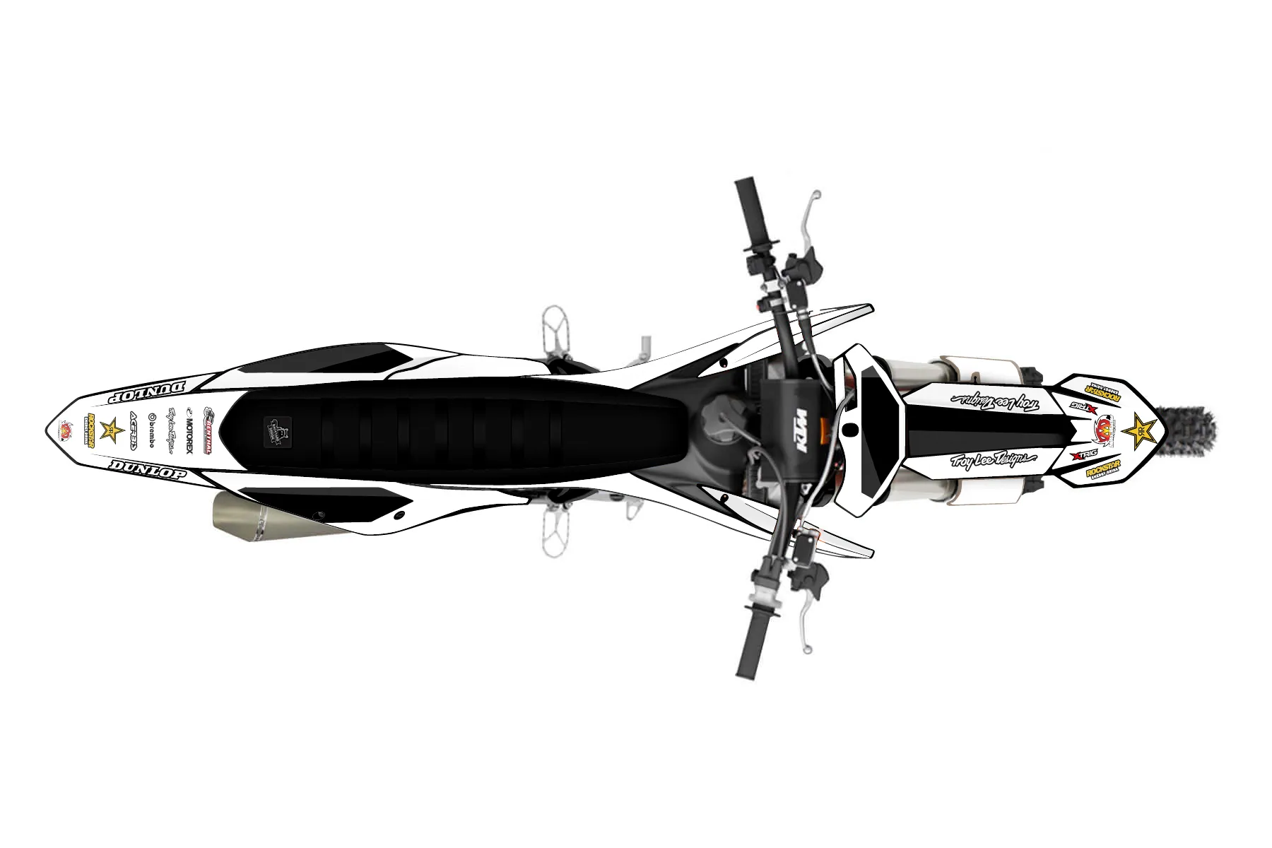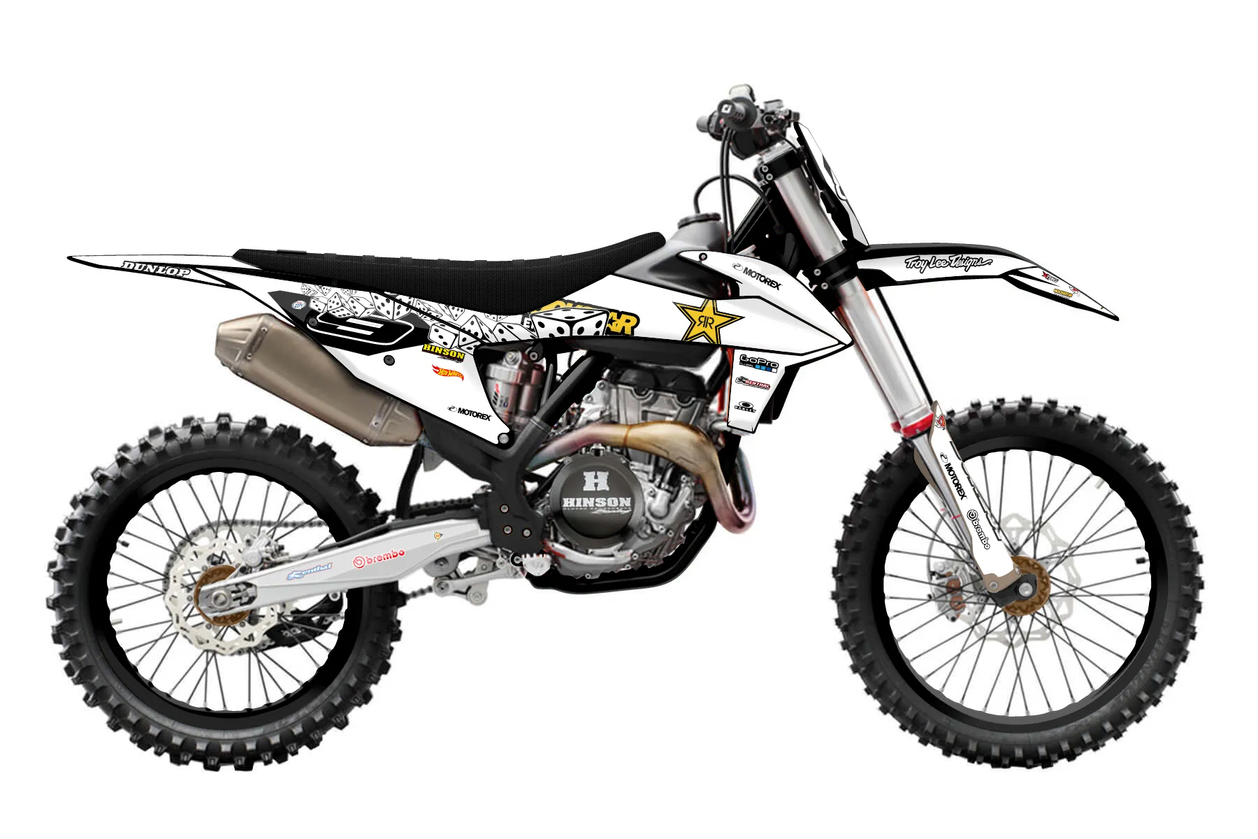«ROCKSTAR (WHITE)» — готовый комплект графики серии Staple для KTM MX Graphic Kit KTM SX-F 350 2019. В комплекте: графика на бак и боковые облицовки, крылья (переднее и заднее), передний щиток, номерные таблички, защита вилки. Материал: ПВХ-винил 80 мкр с холодной ламинацией 300 мкр, общая толщина 380 мкр; покрытие глянцевое или матовое на выбор. Устойчив к UV-излучению, воде, бензину и мойке высокого давления. Клей акриловый на сольвентной основе — постоянный, для гибких пластиков. На простых поверхностях монтируется без нагрева; для сложных изгибов рекомендуем фен. Этот пресет можно заказать как есть или взять за основу в конструкторе: поменять цвета, добавить стартовый номер и свой бренд. Производство — 3–5 рабочих дней, доставка по России СДЭКом или Почтой, по СНГ — курьерскими службами.