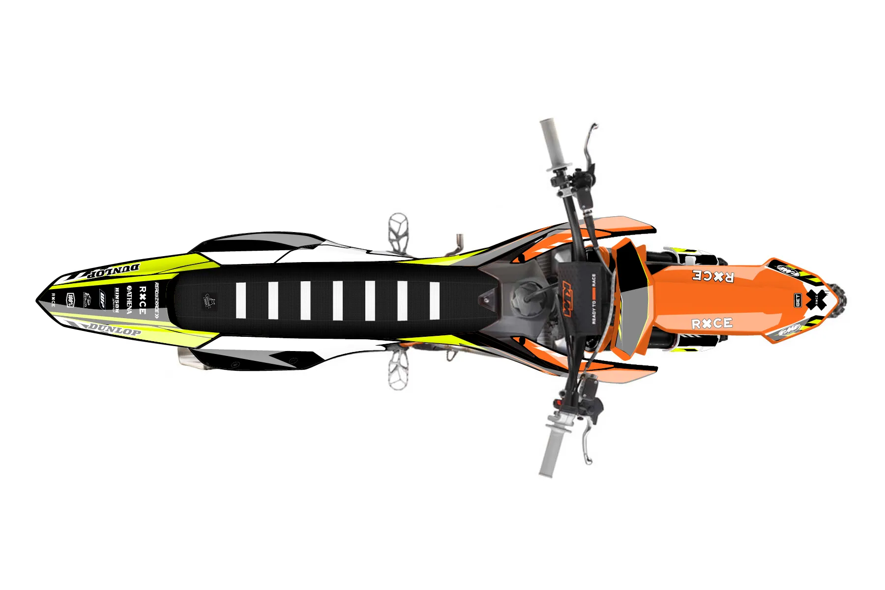 «Chase Neon» — готовый комплект графики серии Maverick для KTM MX Graphic Kit KTM SX-F 350 2023. В комплекте: графика на бак и боковые облицовки, крылья (переднее и заднее), передний щиток, номерные таблички, защита вилки. Материал: ПВХ-винил 80 мкр с холодной ламинацией 300 мкр, общая толщина 380 мкр; покрытие глянцевое или матовое на выбор. Устойчив к UV-излучению, воде, бензину и мойке высокого давления. Клей акриловый на сольвентной основе — постоянный, для гибких пластиков. На простых поверхностях монтируется без нагрева; для сложных изгибов рекомендуем фен. Этот пресет можно заказать как есть или взять за основу в конструкторе: поменять цвета, добавить стартовый номер и свой бренд. Производство — 3–5 рабочих дней, доставка по России СДЭКом или Почтой, по СНГ — курьерскими службами.