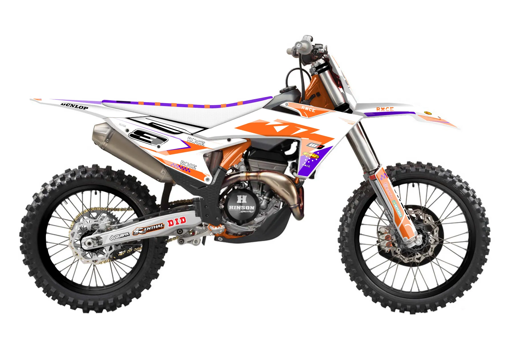 «Retro» — готовый комплект графики серии Staple для KTM MX Graphic Kit KTM SX-F 350 2023. В комплекте: графика на бак и боковые облицовки, крылья (переднее и заднее), передний щиток, номерные таблички, защита вилки. Материал: ПВХ-винил 80 мкр с холодной ламинацией 300 мкр, общая толщина 380 мкр; покрытие глянцевое или матовое на выбор. Устойчив к UV-излучению, воде, бензину и мойке высокого давления. Клей акриловый на сольвентной основе — постоянный, для гибких пластиков. На простых поверхностях монтируется без нагрева; для сложных изгибов рекомендуем фен. Этот пресет можно заказать как есть или взять за основу в конструкторе: поменять цвета, добавить стартовый номер и свой бренд. Производство — 3–5 рабочих дней, доставка по России СДЭКом или Почтой, по СНГ — курьерскими службами.