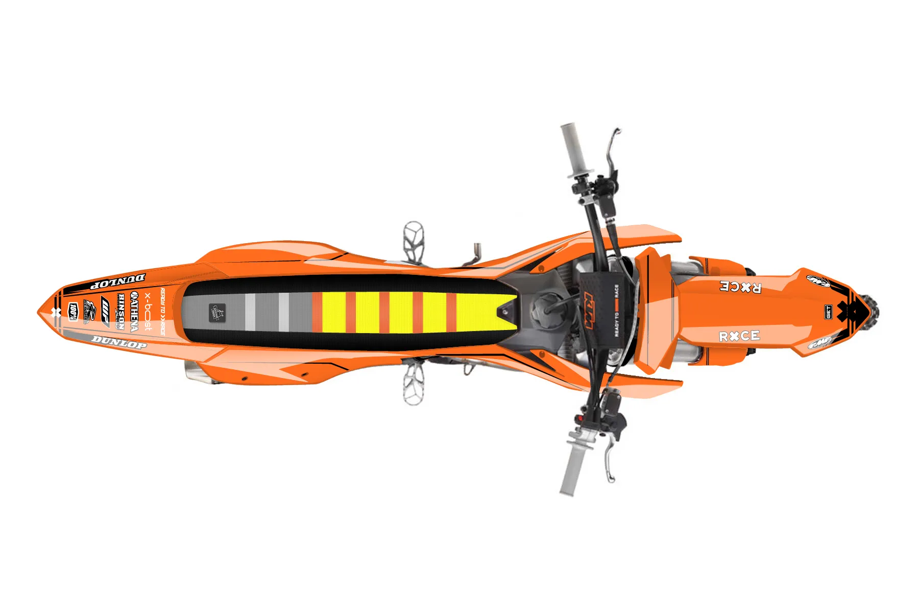 «KTM Kit » — готовый комплект графики серии Untucked для KTM MX Graphic Kit KTM SX-F 350 2023. В комплекте: графика на бак и боковые облицовки, крылья (переднее и заднее), передний щиток, номерные таблички, защита вилки. Материал: ПВХ-винил 80 мкр с холодной ламинацией 300 мкр, общая толщина 380 мкр; покрытие глянцевое или матовое на выбор. Устойчив к UV-излучению, воде, бензину и мойке высокого давления. Клей акриловый на сольвентной основе — постоянный, для гибких пластиков. На простых поверхностях монтируется без нагрева; для сложных изгибов рекомендуем фен. Этот пресет можно заказать как есть или взять за основу в конструкторе: поменять цвета, добавить стартовый номер и свой бренд. Производство — 3–5 рабочих дней, доставка по России СДЭКом или Почтой, по СНГ — курьерскими службами.