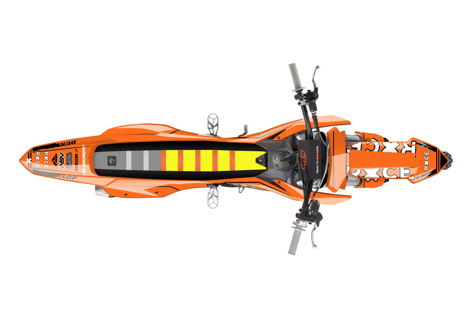 «KTMKIT» — готовый комплект графики серии Untucked для KTM MX Graphic Kit KTM SX-F 350 2023. В комплекте: графика на бак и боковые облицовки, крылья (переднее и заднее), передний щиток, номерные таблички, защита вилки. Материал: ПВХ-винил 80 мкр с холодной ламинацией 300 мкр, общая толщина 380 мкр; покрытие глянцевое или матовое на выбор. Устойчив к UV-излучению, воде, бензину и мойке высокого давления. Клей акриловый на сольвентной основе — постоянный, для гибких пластиков. На простых поверхностях монтируется без нагрева; для сложных изгибов рекомендуем фен. Этот пресет можно заказать как есть или взять за основу в конструкторе: поменять цвета, добавить стартовый номер и свой бренд. Производство — 3–5 рабочих дней, доставка по России СДЭКом или Почтой, по СНГ — курьерскими службами.
