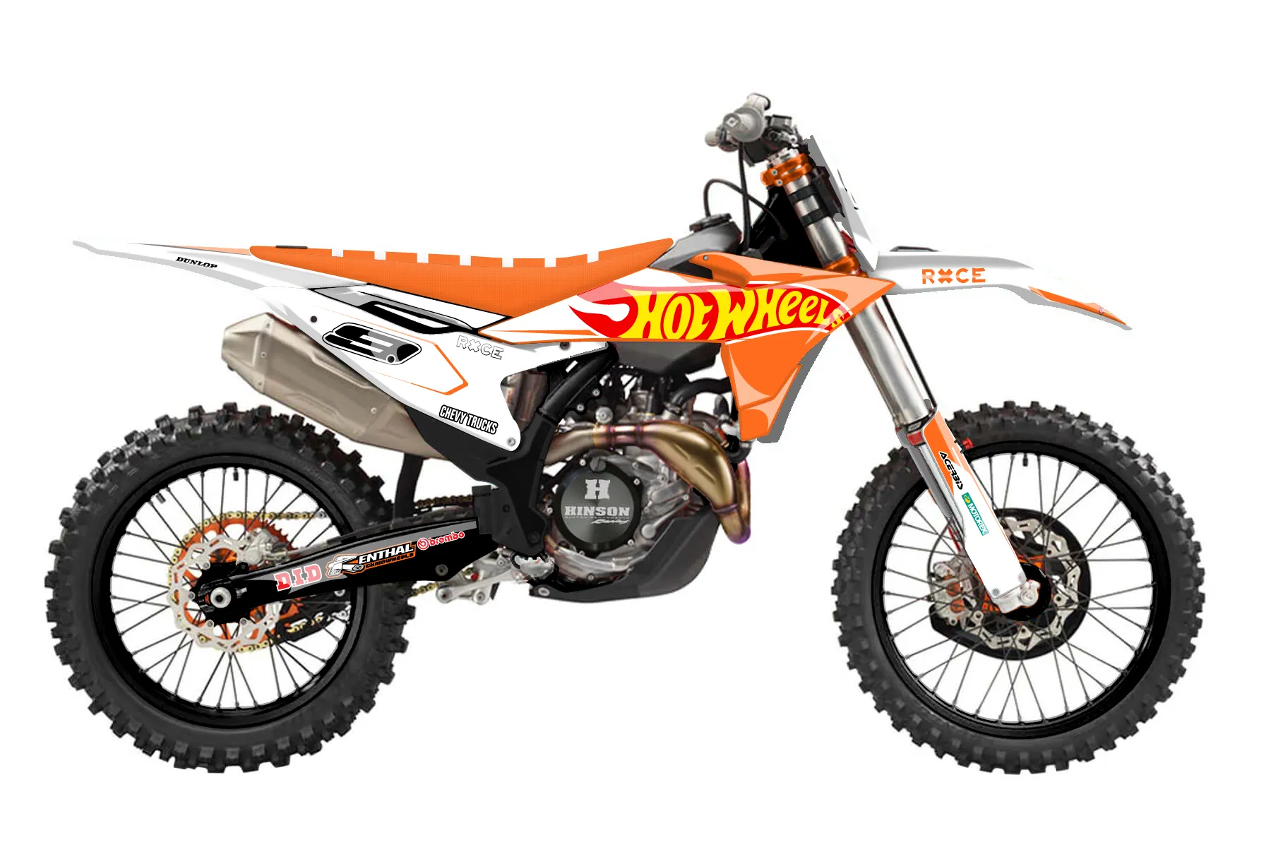 «hotwheels» — готовый комплект графики серии Flow для KTM MX Graphic Kit KTM SX-F 350 2025. В комплекте: графика на бак и боковые облицовки, крылья (переднее и заднее), передний щиток, номерные таблички, защита вилки. Материал: ПВХ-винил 80 мкр с холодной ламинацией 300 мкр, общая толщина 380 мкр; покрытие глянцевое или матовое на выбор. Устойчив к UV-излучению, воде, бензину и мойке высокого давления. Клей акриловый на сольвентной основе — постоянный, для гибких пластиков. На простых поверхностях монтируется без нагрева; для сложных изгибов рекомендуем фен. Этот пресет можно заказать как есть или взять за основу в конструкторе: поменять цвета, добавить стартовый номер и свой бренд. Производство — 3–5 рабочих дней, доставка по России СДЭКом или Почтой, по СНГ — курьерскими службами.