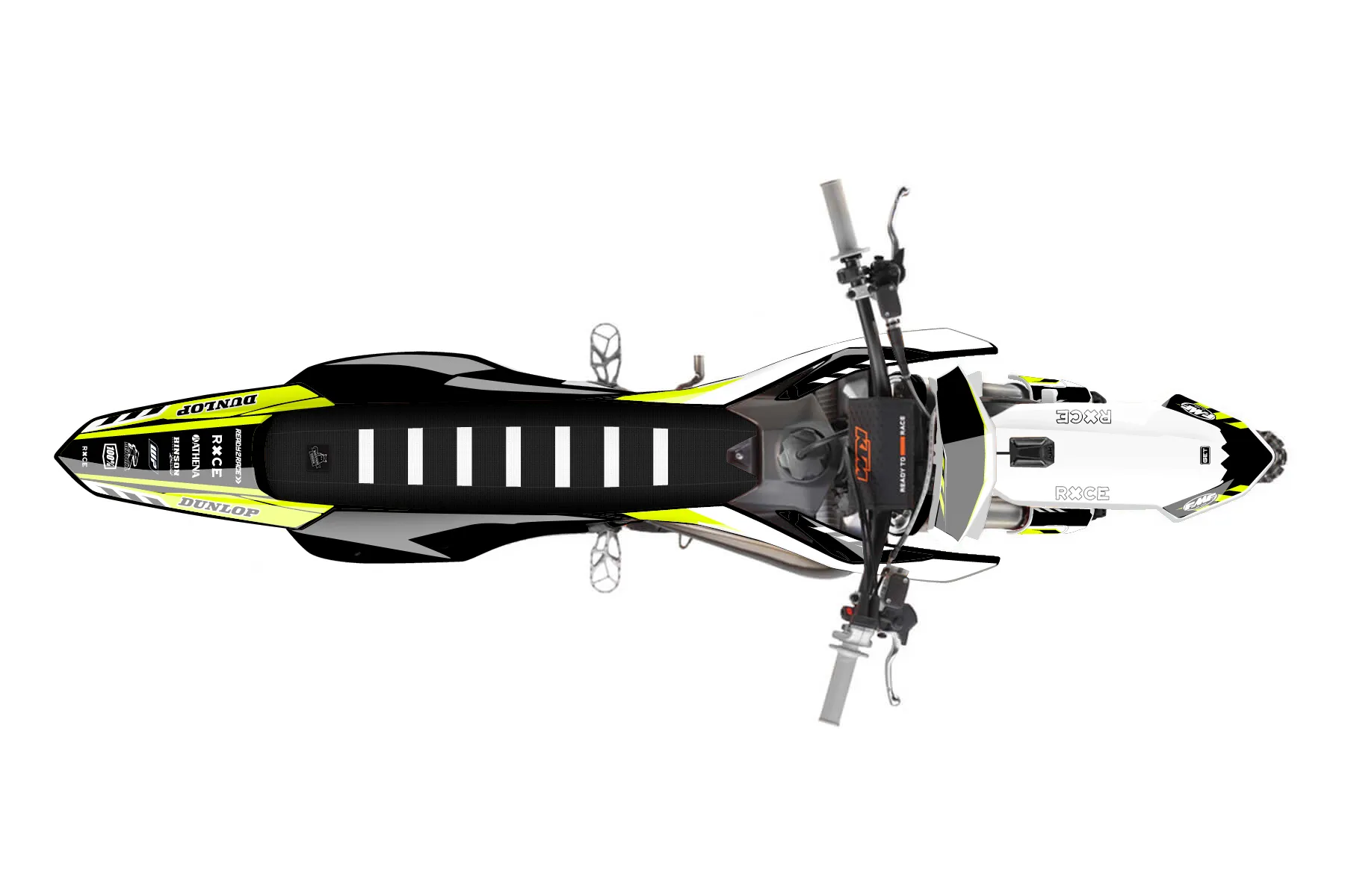 «Grip Neon» — готовый комплект графики серии Maverick для KTM MX Graphic Kit KTM SX-F 350 2025. В комплекте: графика на бак и боковые облицовки, крылья (переднее и заднее), передний щиток, номерные таблички, защита вилки. Материал: ПВХ-винил 80 мкр с холодной ламинацией 300 мкр, общая толщина 380 мкр; покрытие глянцевое или матовое на выбор. Устойчив к UV-излучению, воде, бензину и мойке высокого давления. Клей акриловый на сольвентной основе — постоянный, для гибких пластиков. На простых поверхностях монтируется без нагрева; для сложных изгибов рекомендуем фен. Этот пресет можно заказать как есть или взять за основу в конструкторе: поменять цвета, добавить стартовый номер и свой бренд. Производство — 3–5 рабочих дней, доставка по России СДЭКом или Почтой, по СНГ — курьерскими службами.