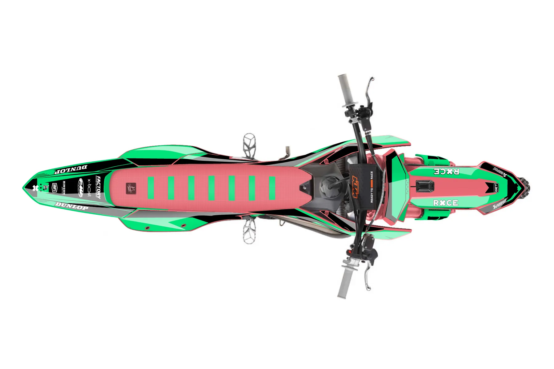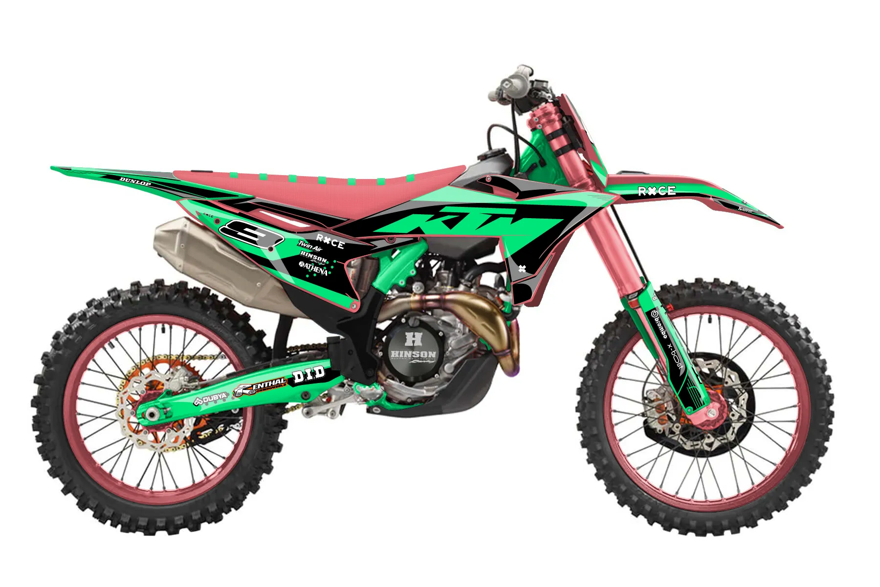 «Pink and Teel» — готовый комплект графики серии Staple для KTM MX Graphic Kit KTM SX-F 350 2025. В комплекте: графика на бак и боковые облицовки, крылья (переднее и заднее), передний щиток, номерные таблички, защита вилки. Материал: ПВХ-винил 80 мкр с холодной ламинацией 300 мкр, общая толщина 380 мкр; покрытие глянцевое или матовое на выбор. Устойчив к UV-излучению, воде, бензину и мойке высокого давления. Клей акриловый на сольвентной основе — постоянный, для гибких пластиков. На простых поверхностях монтируется без нагрева; для сложных изгибов рекомендуем фен. Этот пресет можно заказать как есть или взять за основу в конструкторе: поменять цвета, добавить стартовый номер и свой бренд. Производство — 3–5 рабочих дней, доставка по России СДЭКом или Почтой, по СНГ — курьерскими службами.