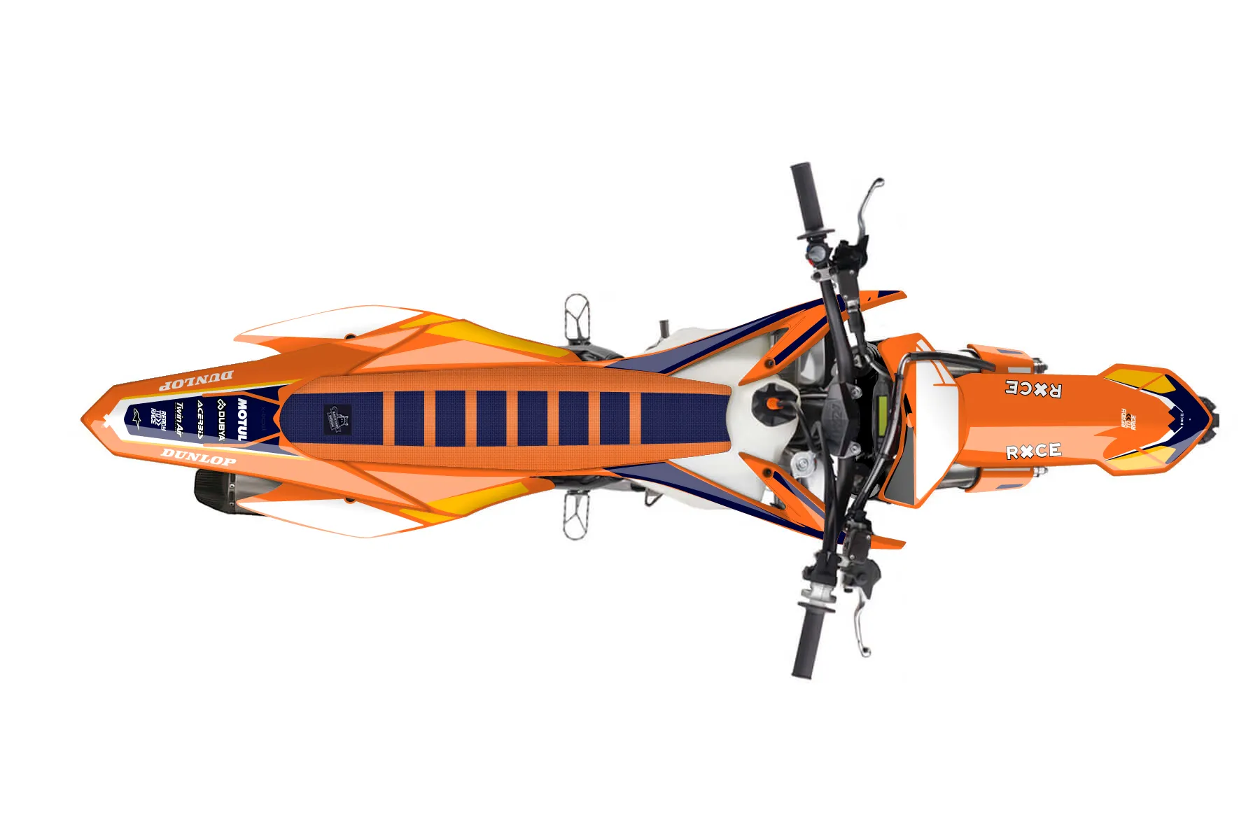 «Pixel» — готовый комплект графики серии Flow для KTM MX Graphic Kit KTM SX-F 450 2013. В комплекте: графика на бак и боковые облицовки, крылья (переднее и заднее), передний щиток, номерные таблички, защита вилки. Материал: ПВХ-винил 80 мкр с холодной ламинацией 300 мкр, общая толщина 380 мкр; покрытие глянцевое или матовое на выбор. Устойчив к UV-излучению, воде, бензину и мойке высокого давления. Клей акриловый на сольвентной основе — постоянный, для гибких пластиков. На простых поверхностях монтируется без нагрева; для сложных изгибов рекомендуем фен. Этот пресет можно заказать как есть или взять за основу в конструкторе: поменять цвета, добавить стартовый номер и свой бренд. Производство — 3–5 рабочих дней, доставка по России СДЭКом или Почтой, по СНГ — курьерскими службами.