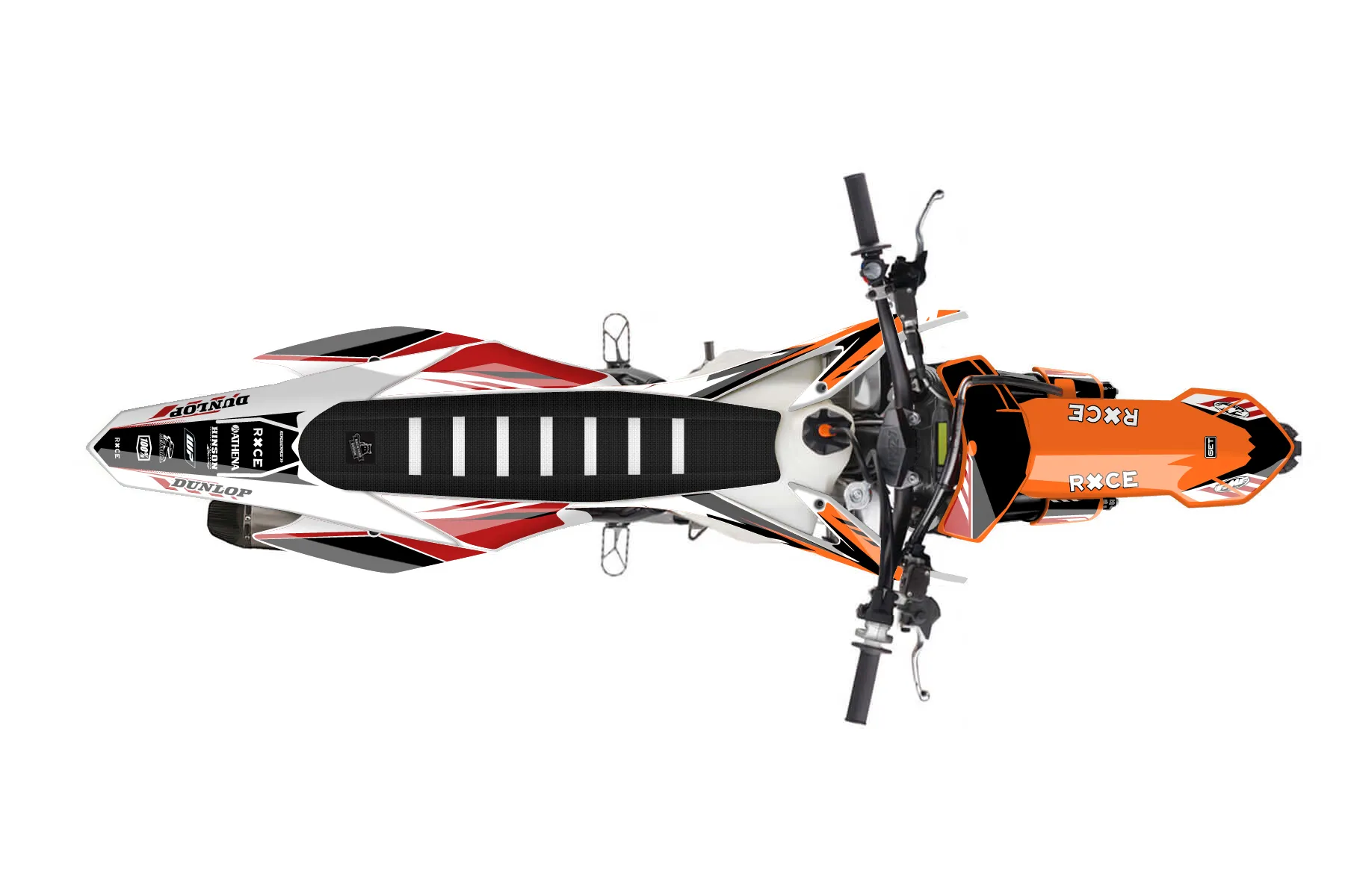 «Dude» — готовый комплект графики серии Maverick для KTM MX Graphic Kit KTM SX-F 450 2013. В комплекте: графика на бак и боковые облицовки, крылья (переднее и заднее), передний щиток, номерные таблички, защита вилки. Материал: ПВХ-винил 80 мкр с холодной ламинацией 300 мкр, общая толщина 380 мкр; покрытие глянцевое или матовое на выбор. Устойчив к UV-излучению, воде, бензину и мойке высокого давления. Клей акриловый на сольвентной основе — постоянный, для гибких пластиков. На простых поверхностях монтируется без нагрева; для сложных изгибов рекомендуем фен. Этот пресет можно заказать как есть или взять за основу в конструкторе: поменять цвета, добавить стартовый номер и свой бренд. Производство — 3–5 рабочих дней, доставка по России СДЭКом или Почтой, по СНГ — курьерскими службами.
