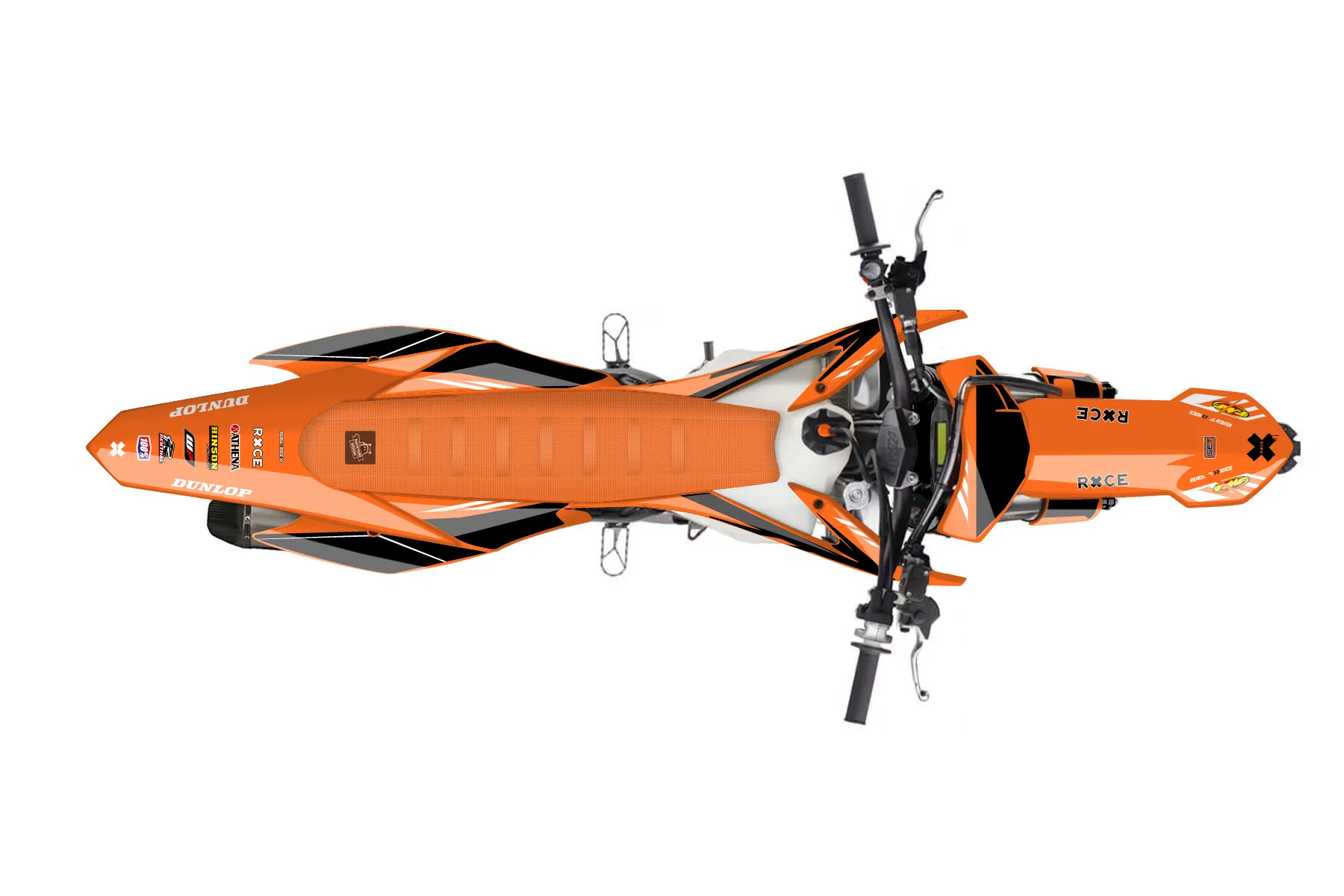 «Express» — готовый комплект графики серии Maverick для KTM MX Graphic Kit KTM SX-F 450 2013. В комплекте: графика на бак и боковые облицовки, крылья (переднее и заднее), передний щиток, номерные таблички, защита вилки. Материал: ПВХ-винил 80 мкр с холодной ламинацией 300 мкр, общая толщина 380 мкр; покрытие глянцевое или матовое на выбор. Устойчив к UV-излучению, воде, бензину и мойке высокого давления. Клей акриловый на сольвентной основе — постоянный, для гибких пластиков. На простых поверхностях монтируется без нагрева; для сложных изгибов рекомендуем фен. Этот пресет можно заказать как есть или взять за основу в конструкторе: поменять цвета, добавить стартовый номер и свой бренд. Производство — 3–5 рабочих дней, доставка по России СДЭКом или Почтой, по СНГ — курьерскими службами.