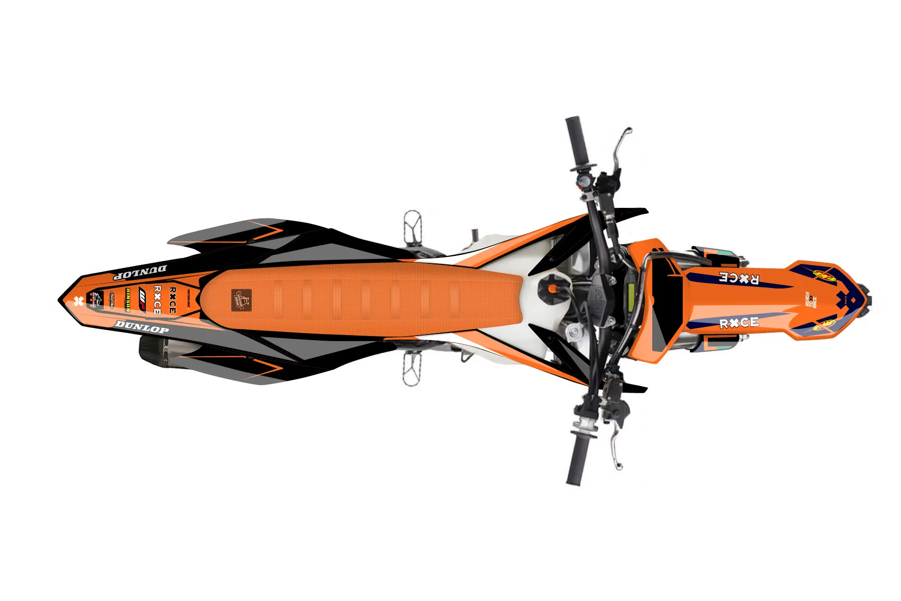 «Scoop» — готовый комплект графики серии Staple для KTM MX Graphic Kit KTM SX-F 450 2013. В комплекте: графика на бак и боковые облицовки, крылья (переднее и заднее), передний щиток, номерные таблички, защита вилки. Материал: ПВХ-винил 80 мкр с холодной ламинацией 300 мкр, общая толщина 380 мкр; покрытие глянцевое или матовое на выбор. Устойчив к UV-излучению, воде, бензину и мойке высокого давления. Клей акриловый на сольвентной основе — постоянный, для гибких пластиков. На простых поверхностях монтируется без нагрева; для сложных изгибов рекомендуем фен. Этот пресет можно заказать как есть или взять за основу в конструкторе: поменять цвета, добавить стартовый номер и свой бренд. Производство — 3–5 рабочих дней, доставка по России СДЭКом или Почтой, по СНГ — курьерскими службами.