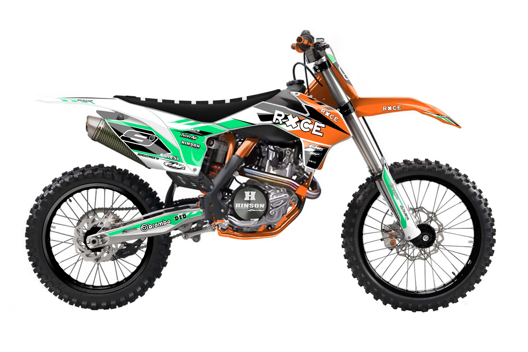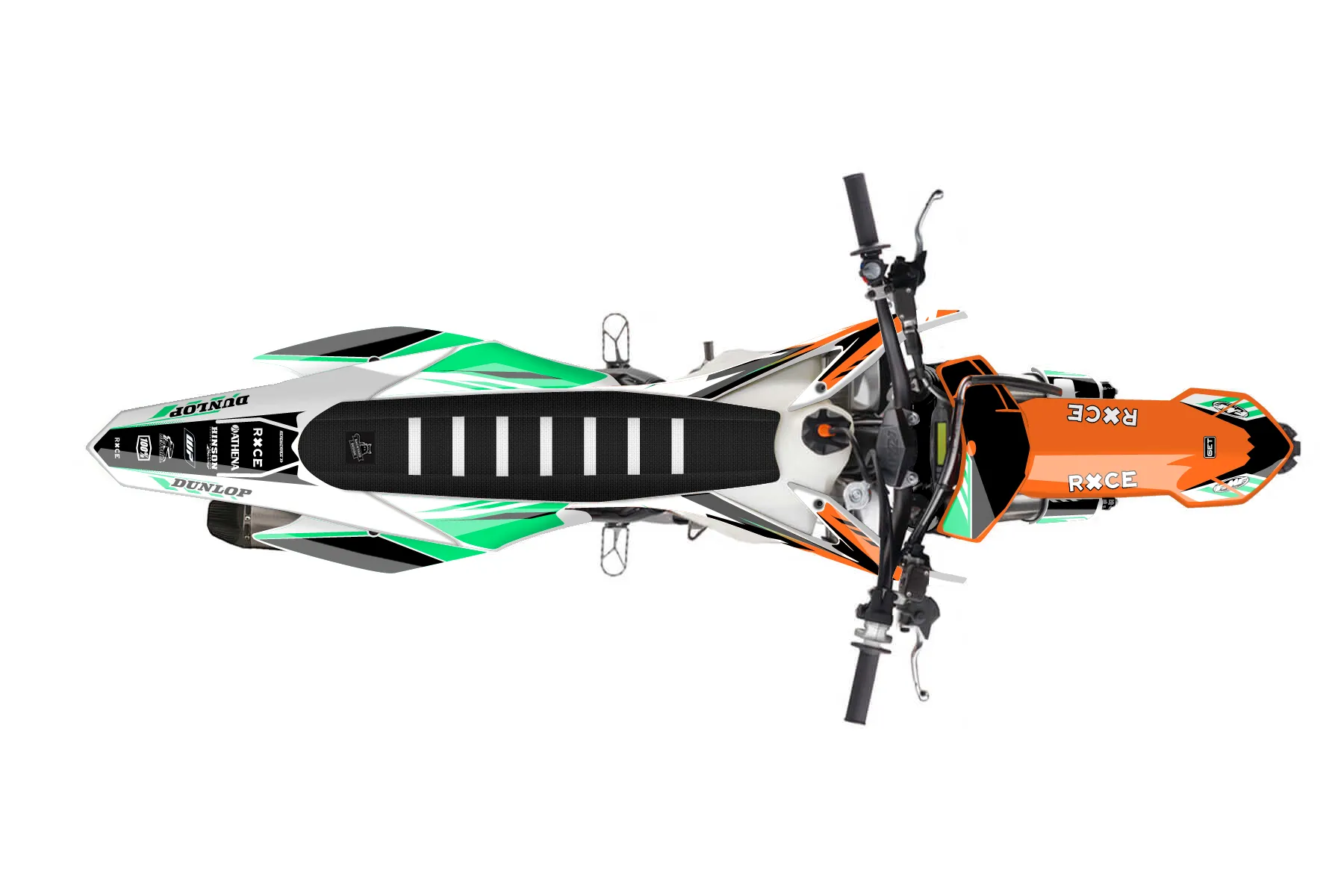 «Future» — готовый комплект графики серии Maverick для KTM MX Graphic Kit KTM SX-F 450 2015. В комплекте: графика на бак и боковые облицовки, крылья (переднее и заднее), передний щиток, номерные таблички, защита вилки. Материал: ПВХ-винил 80 мкр с холодной ламинацией 300 мкр, общая толщина 380 мкр; покрытие глянцевое или матовое на выбор. Устойчив к UV-излучению, воде, бензину и мойке высокого давления. Клей акриловый на сольвентной основе — постоянный, для гибких пластиков. На простых поверхностях монтируется без нагрева; для сложных изгибов рекомендуем фен. Этот пресет можно заказать как есть или взять за основу в конструкторе: поменять цвета, добавить стартовый номер и свой бренд. Производство — 3–5 рабочих дней, доставка по России СДЭКом или Почтой, по СНГ — курьерскими службами.