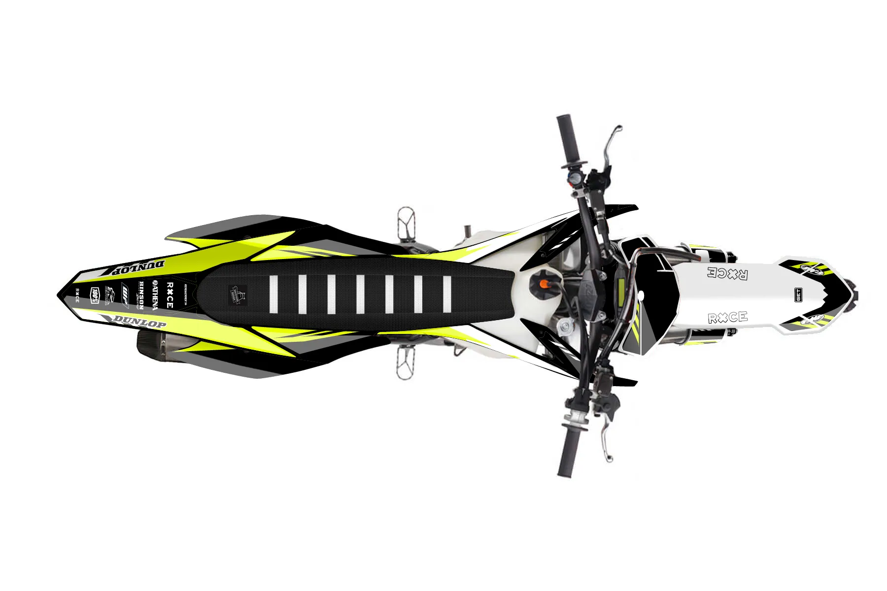 «Grip Neon» — готовый комплект графики серии Maverick для KTM MX Graphic Kit KTM SX-F 450 2015. В комплекте: графика на бак и боковые облицовки, крылья (переднее и заднее), передний щиток, номерные таблички, защита вилки. Материал: ПВХ-винил 80 мкр с холодной ламинацией 300 мкр, общая толщина 380 мкр; покрытие глянцевое или матовое на выбор. Устойчив к UV-излучению, воде, бензину и мойке высокого давления. Клей акриловый на сольвентной основе — постоянный, для гибких пластиков. На простых поверхностях монтируется без нагрева; для сложных изгибов рекомендуем фен. Этот пресет можно заказать как есть или взять за основу в конструкторе: поменять цвета, добавить стартовый номер и свой бренд. Производство — 3–5 рабочих дней, доставка по России СДЭКом или Почтой, по СНГ — курьерскими службами.