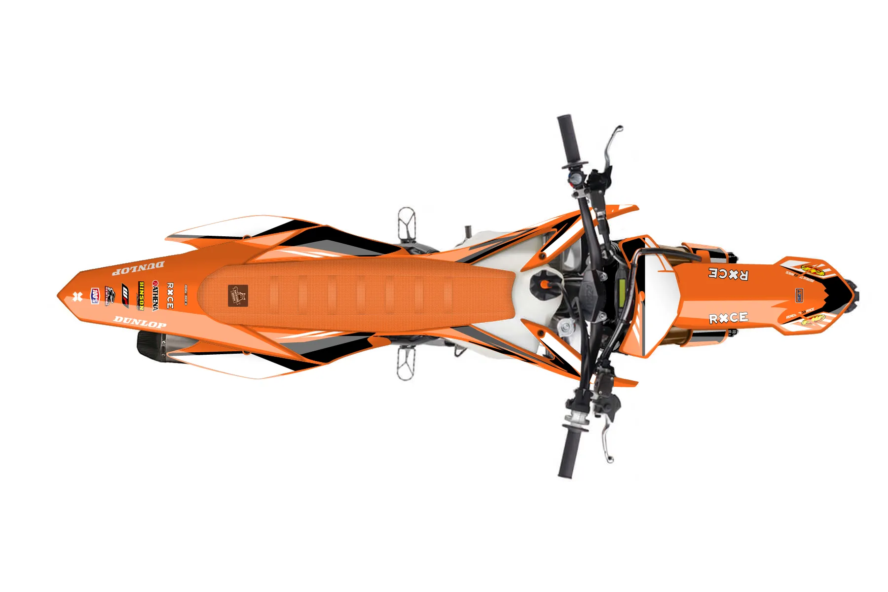 «Rapid» — готовый комплект графики серии Maverick для KTM MX Graphic Kit KTM SX-F 450 2015. В комплекте: графика на бак и боковые облицовки, крылья (переднее и заднее), передний щиток, номерные таблички, защита вилки. Материал: ПВХ-винил 80 мкр с холодной ламинацией 300 мкр, общая толщина 380 мкр; покрытие глянцевое или матовое на выбор. Устойчив к UV-излучению, воде, бензину и мойке высокого давления. Клей акриловый на сольвентной основе — постоянный, для гибких пластиков. На простых поверхностях монтируется без нагрева; для сложных изгибов рекомендуем фен. Этот пресет можно заказать как есть или взять за основу в конструкторе: поменять цвета, добавить стартовый номер и свой бренд. Производство — 3–5 рабочих дней, доставка по России СДЭКом или Почтой, по СНГ — курьерскими службами.