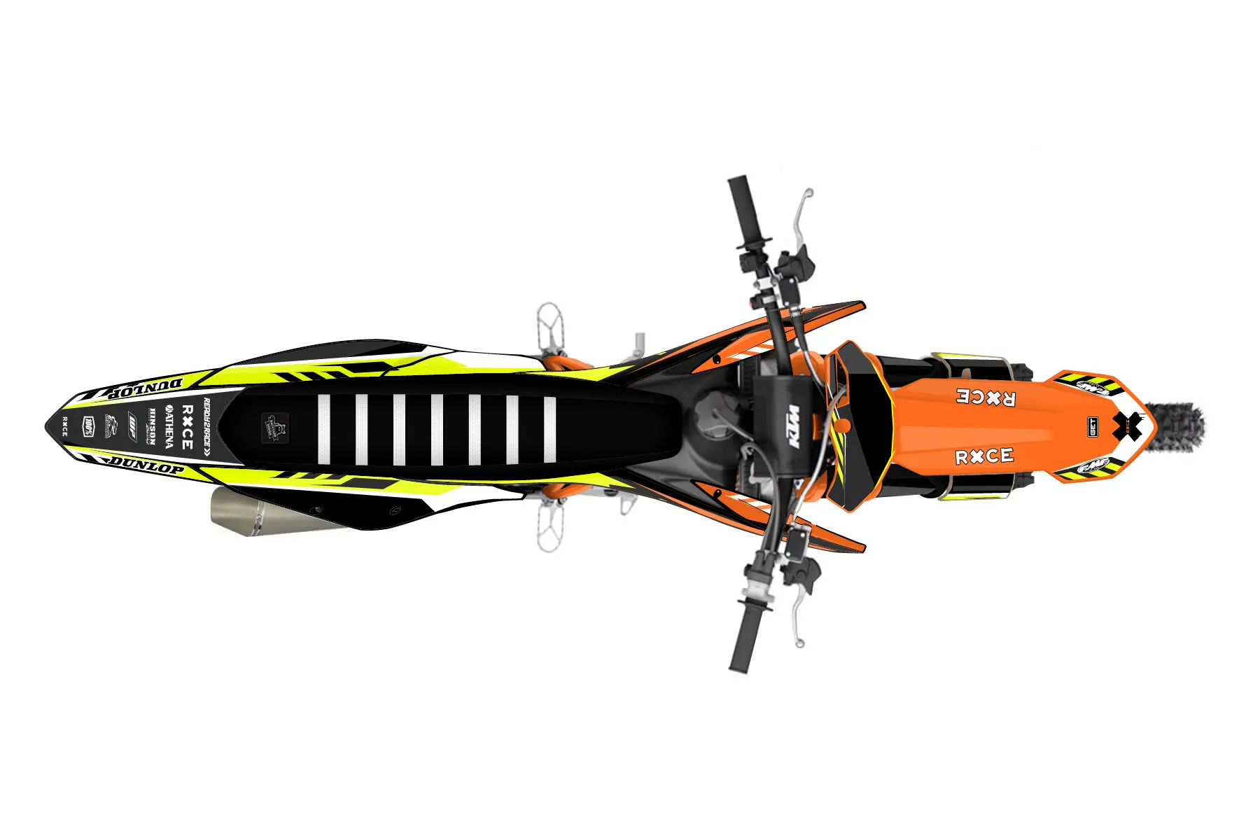 «Chase Neon» — готовый комплект графики серии Maverick для KTM MX Graphic Kit KTM SX-F 450 2019. В комплекте: графика на бак и боковые облицовки, крылья (переднее и заднее), передний щиток, номерные таблички, защита вилки. Материал: ПВХ-винил 80 мкр с холодной ламинацией 300 мкр, общая толщина 380 мкр; покрытие глянцевое или матовое на выбор. Устойчив к UV-излучению, воде, бензину и мойке высокого давления. Клей акриловый на сольвентной основе — постоянный, для гибких пластиков. На простых поверхностях монтируется без нагрева; для сложных изгибов рекомендуем фен. Этот пресет можно заказать как есть или взять за основу в конструкторе: поменять цвета, добавить стартовый номер и свой бренд. Производство — 3–5 рабочих дней, доставка по России СДЭКом или Почтой, по СНГ — курьерскими службами.