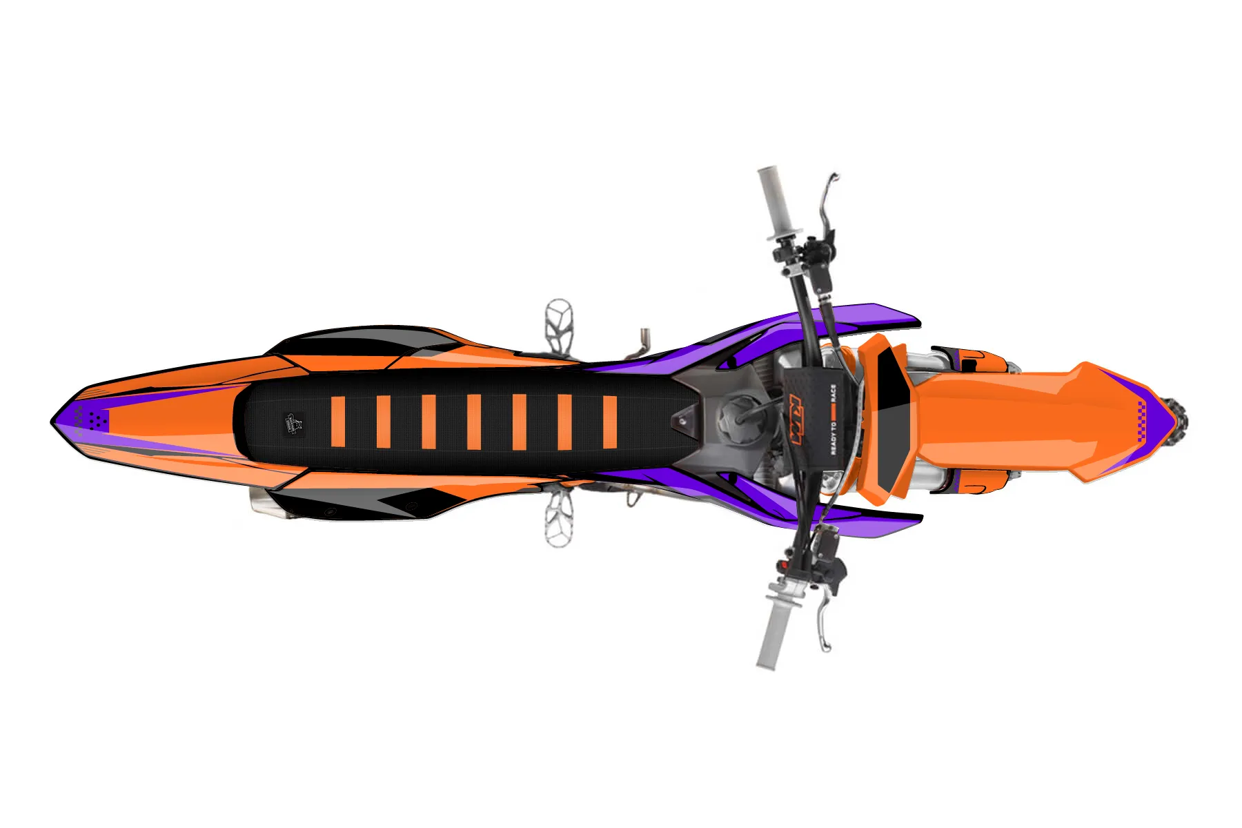 «KTM22.5PURP ED 2» — готовый комплект графики серии Staple для KTM MX Graphic Kit KTM SX-F 450 2022. В комплекте: графика на бак и боковые облицовки, крылья (переднее и заднее), передний щиток, номерные таблички, защита вилки. Материал: ПВХ-винил 80 мкр с холодной ламинацией 300 мкр, общая толщина 380 мкр; покрытие глянцевое или матовое на выбор. Устойчив к UV-излучению, воде, бензину и мойке высокого давления. Клей акриловый на сольвентной основе — постоянный, для гибких пластиков. На простых поверхностях монтируется без нагрева; для сложных изгибов рекомендуем фен. Этот пресет можно заказать как есть или взять за основу в конструкторе: поменять цвета, добавить стартовый номер и свой бренд. Производство — 3–5 рабочих дней, доставка по России СДЭКом или Почтой, по СНГ — курьерскими службами.