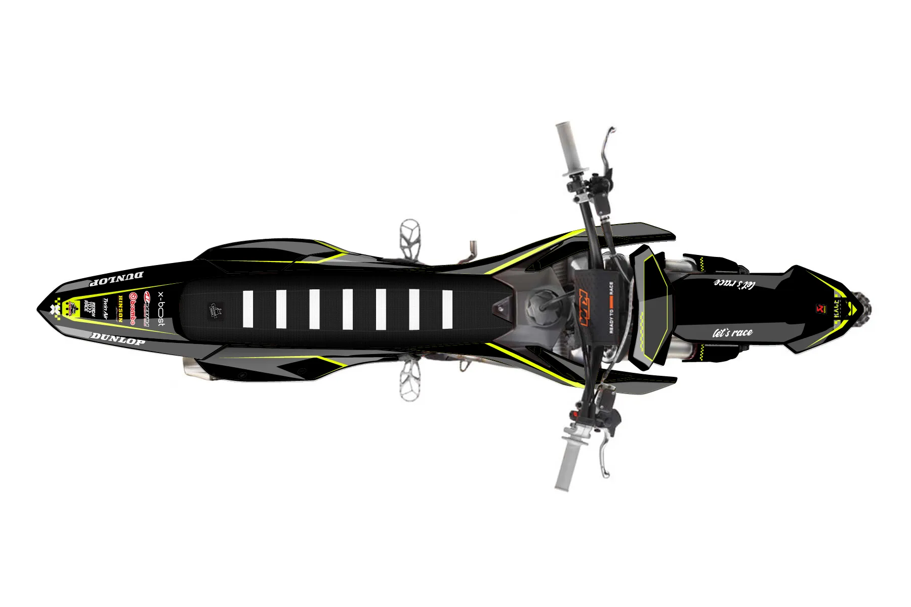 «Refuse Neon» — готовый комплект графики серии Staple для KTM MX Graphic Kit KTM SX-F 450 2022. В комплекте: графика на бак и боковые облицовки, крылья (переднее и заднее), передний щиток, номерные таблички, защита вилки. Материал: ПВХ-винил 80 мкр с холодной ламинацией 300 мкр, общая толщина 380 мкр; покрытие глянцевое или матовое на выбор. Устойчив к UV-излучению, воде, бензину и мойке высокого давления. Клей акриловый на сольвентной основе — постоянный, для гибких пластиков. На простых поверхностях монтируется без нагрева; для сложных изгибов рекомендуем фен. Этот пресет можно заказать как есть или взять за основу в конструкторе: поменять цвета, добавить стартовый номер и свой бренд. Производство — 3–5 рабочих дней, доставка по России СДЭКом или Почтой, по СНГ — курьерскими службами.
