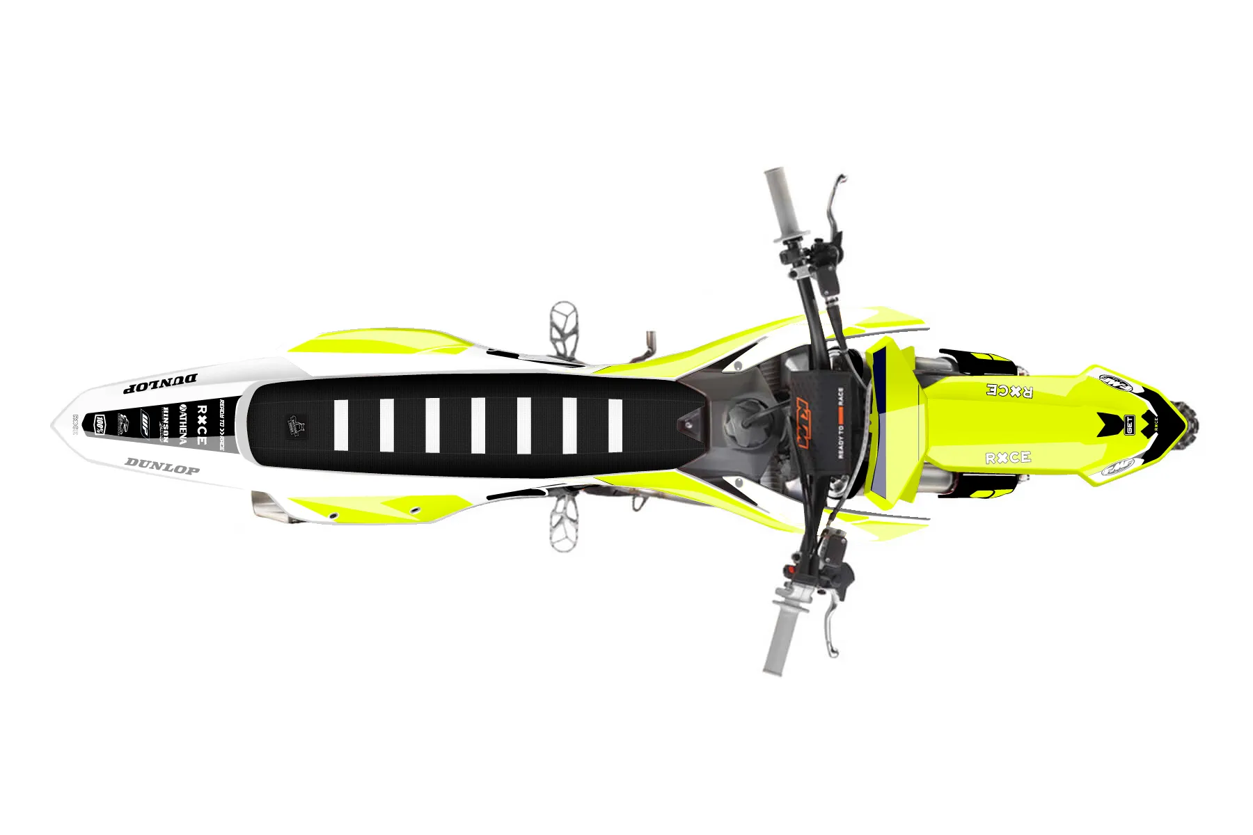 «Rise Fluo» — готовый комплект графики серии Flow для KTM MX Graphic Kit KTM SX-F 450 2023. В комплекте: графика на бак и боковые облицовки, крылья (переднее и заднее), передний щиток, номерные таблички, защита вилки. Материал: ПВХ-винил 80 мкр с холодной ламинацией 300 мкр, общая толщина 380 мкр; покрытие глянцевое или матовое на выбор. Устойчив к UV-излучению, воде, бензину и мойке высокого давления. Клей акриловый на сольвентной основе — постоянный, для гибких пластиков. На простых поверхностях монтируется без нагрева; для сложных изгибов рекомендуем фен. Этот пресет можно заказать как есть или взять за основу в конструкторе: поменять цвета, добавить стартовый номер и свой бренд. Производство — 3–5 рабочих дней, доставка по России СДЭКом или Почтой, по СНГ — курьерскими службами.