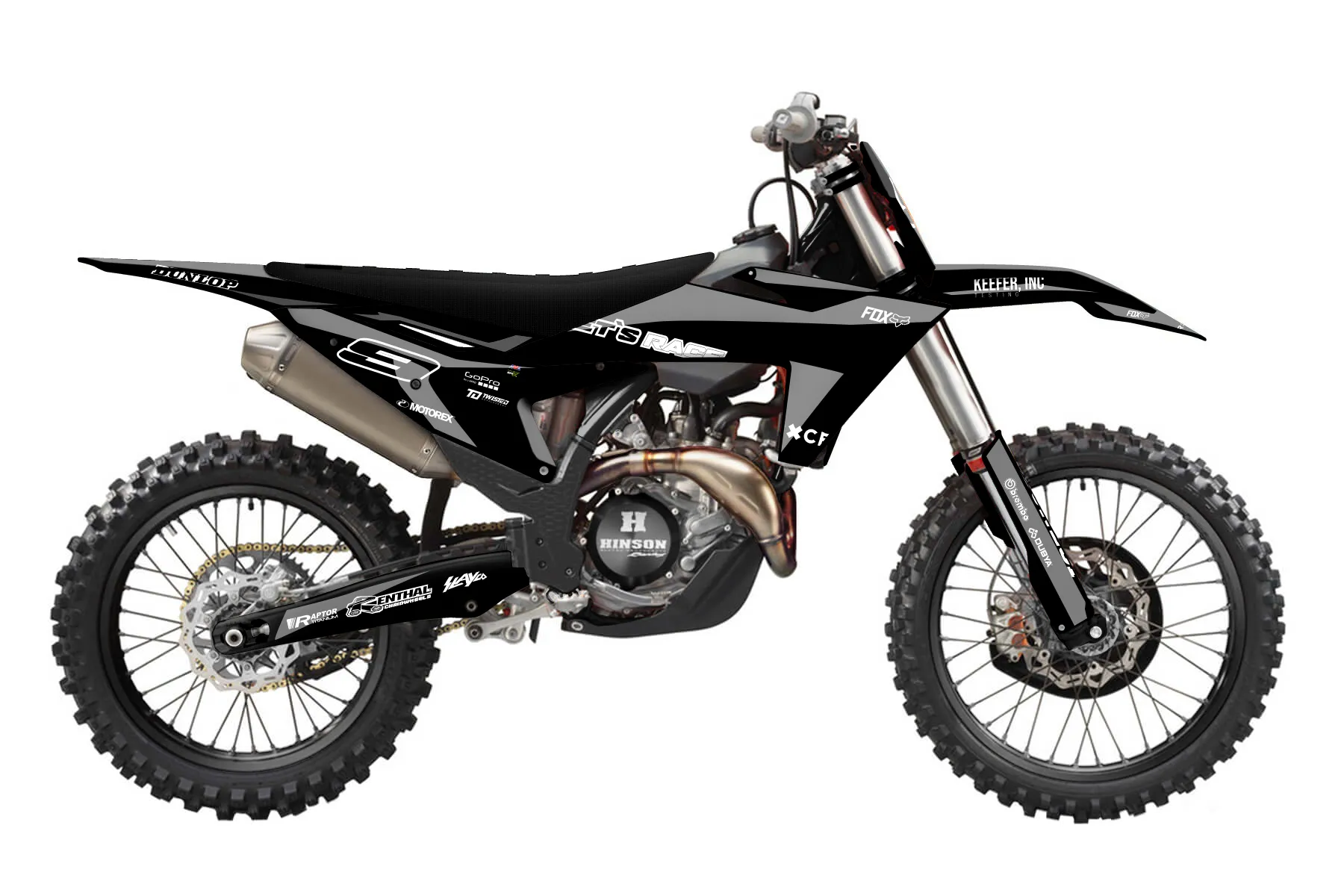 «KTM ME Black» — готовый комплект графики серии Staple для KTM MX Graphic Kit KTM SX-F 450 2023. В комплекте: графика на бак и боковые облицовки, крылья (переднее и заднее), передний щиток, номерные таблички, защита вилки. Материал: ПВХ-винил 80 мкр с холодной ламинацией 300 мкр, общая толщина 380 мкр; покрытие глянцевое или матовое на выбор. Устойчив к UV-излучению, воде, бензину и мойке высокого давления. Клей акриловый на сольвентной основе — постоянный, для гибких пластиков. На простых поверхностях монтируется без нагрева; для сложных изгибов рекомендуем фен. Этот пресет можно заказать как есть или взять за основу в конструкторе: поменять цвета, добавить стартовый номер и свой бренд. Производство — 3–5 рабочих дней, доставка по России СДЭКом или Почтой, по СНГ — курьерскими службами.