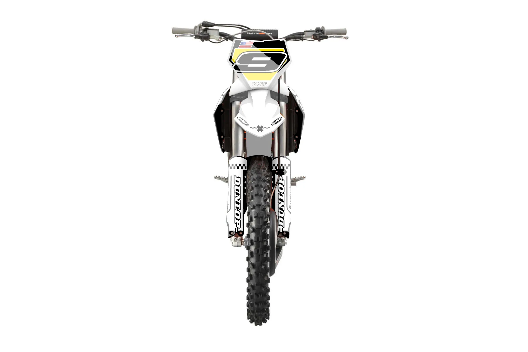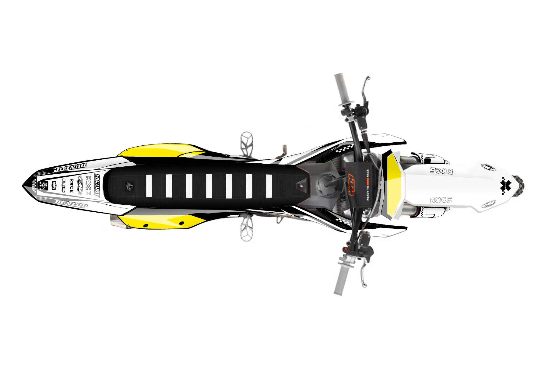 «White KTM» — готовый комплект графики серии Staple для KTM MX Graphic Kit KTM SX-F 450 2023. В комплекте: графика на бак и боковые облицовки, крылья (переднее и заднее), передний щиток, номерные таблички, защита вилки. Материал: ПВХ-винил 80 мкр с холодной ламинацией 300 мкр, общая толщина 380 мкр; покрытие глянцевое или матовое на выбор. Устойчив к UV-излучению, воде, бензину и мойке высокого давления. Клей акриловый на сольвентной основе — постоянный, для гибких пластиков. На простых поверхностях монтируется без нагрева; для сложных изгибов рекомендуем фен. Этот пресет можно заказать как есть или взять за основу в конструкторе: поменять цвета, добавить стартовый номер и свой бренд. Производство — 3–5 рабочих дней, доставка по России СДЭКом или Почтой, по СНГ — курьерскими службами.
