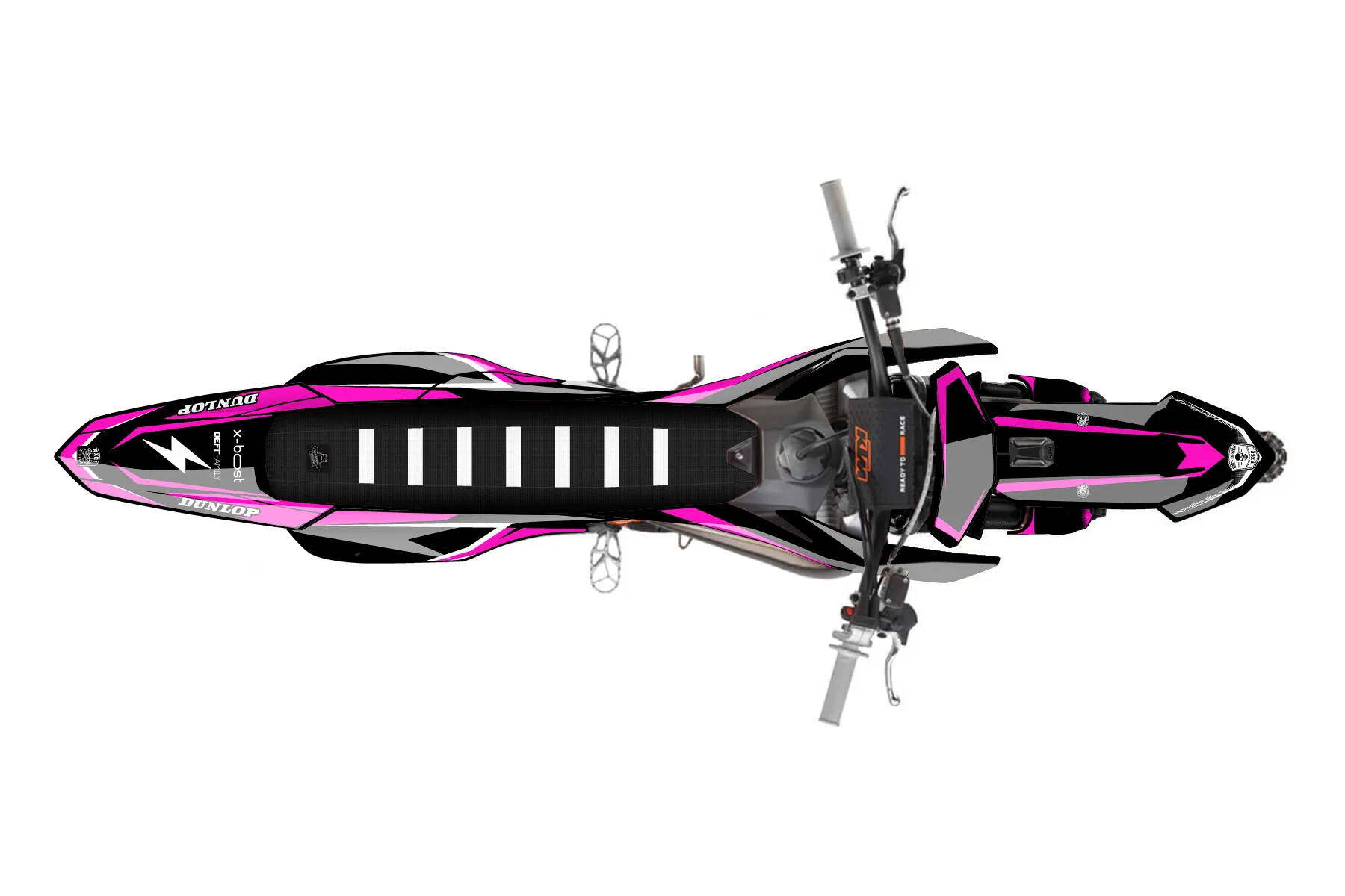 «Extreme» — готовый комплект графики серии Fusion для KTM MX Graphic Kit KTM SX-F 450 2025. В комплекте: графика на бак и боковые облицовки, крылья (переднее и заднее), передний щиток, номерные таблички, защита вилки. Материал: ПВХ-винил 80 мкр с холодной ламинацией 300 мкр, общая толщина 380 мкр; покрытие глянцевое или матовое на выбор. Устойчив к UV-излучению, воде, бензину и мойке высокого давления. Клей акриловый на сольвентной основе — постоянный, для гибких пластиков. На простых поверхностях монтируется без нагрева; для сложных изгибов рекомендуем фен. Этот пресет можно заказать как есть или взять за основу в конструкторе: поменять цвета, добавить стартовый номер и свой бренд. Производство — 3–5 рабочих дней, доставка по России СДЭКом или Почтой, по СНГ — курьерскими службами.