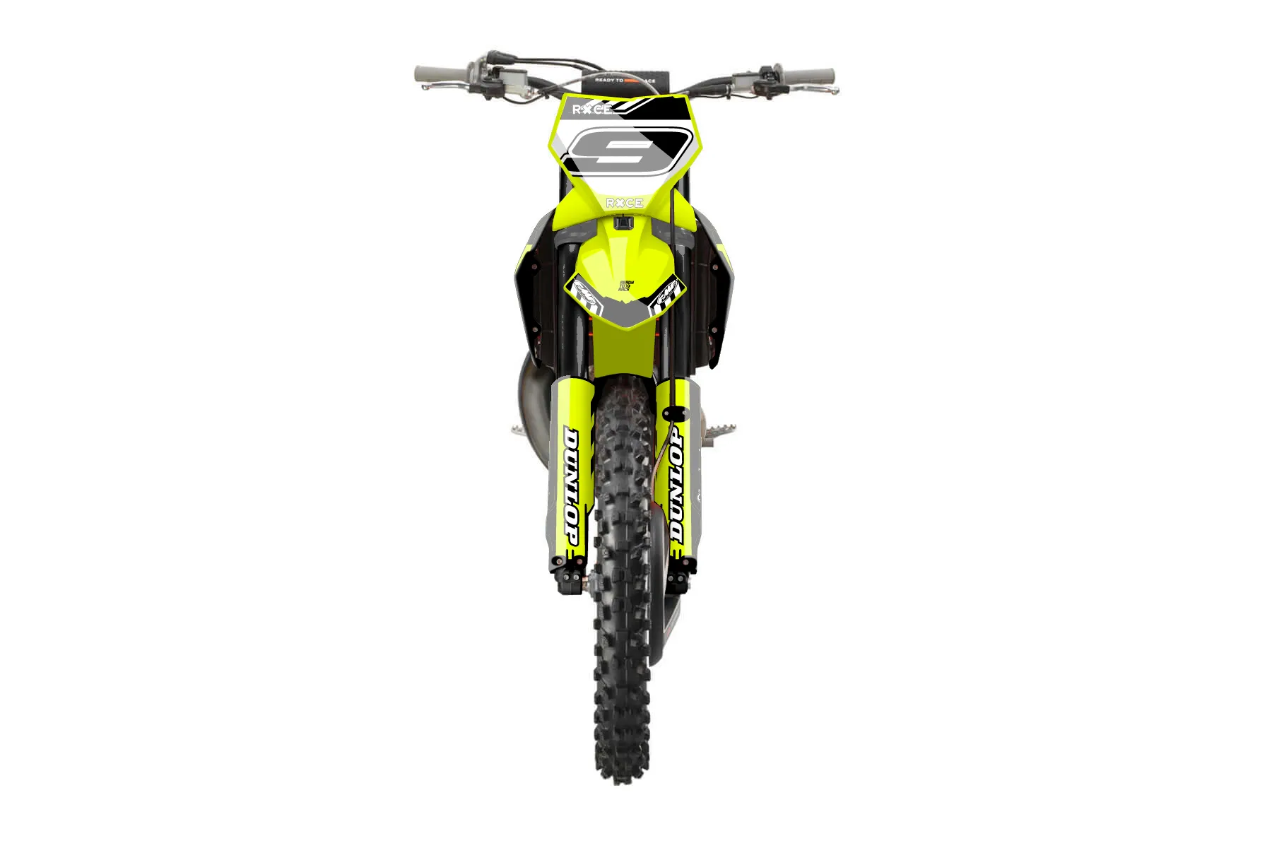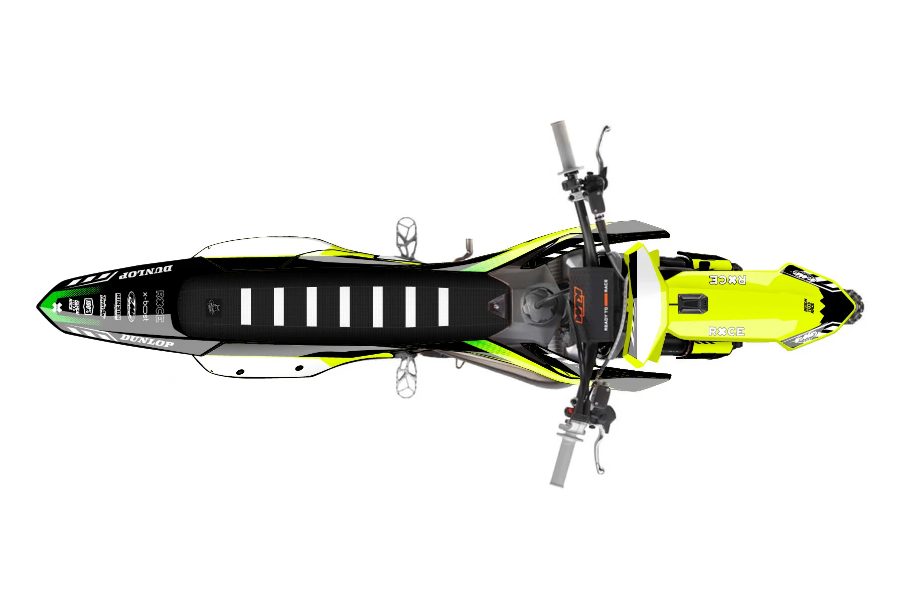 «Volt Neon» — готовый комплект графики серии Maverick для KTM MX Graphic Kit KTM SX-F 450 2025. В комплекте: графика на бак и боковые облицовки, крылья (переднее и заднее), передний щиток, номерные таблички, защита вилки. Материал: ПВХ-винил 80 мкр с холодной ламинацией 300 мкр, общая толщина 380 мкр; покрытие глянцевое или матовое на выбор. Устойчив к UV-излучению, воде, бензину и мойке высокого давления. Клей акриловый на сольвентной основе — постоянный, для гибких пластиков. На простых поверхностях монтируется без нагрева; для сложных изгибов рекомендуем фен. Этот пресет можно заказать как есть или взять за основу в конструкторе: поменять цвета, добавить стартовый номер и свой бренд. Производство — 3–5 рабочих дней, доставка по России СДЭКом или Почтой, по СНГ — курьерскими службами.