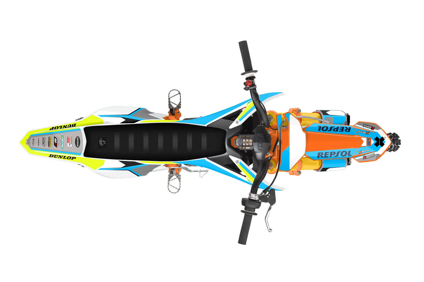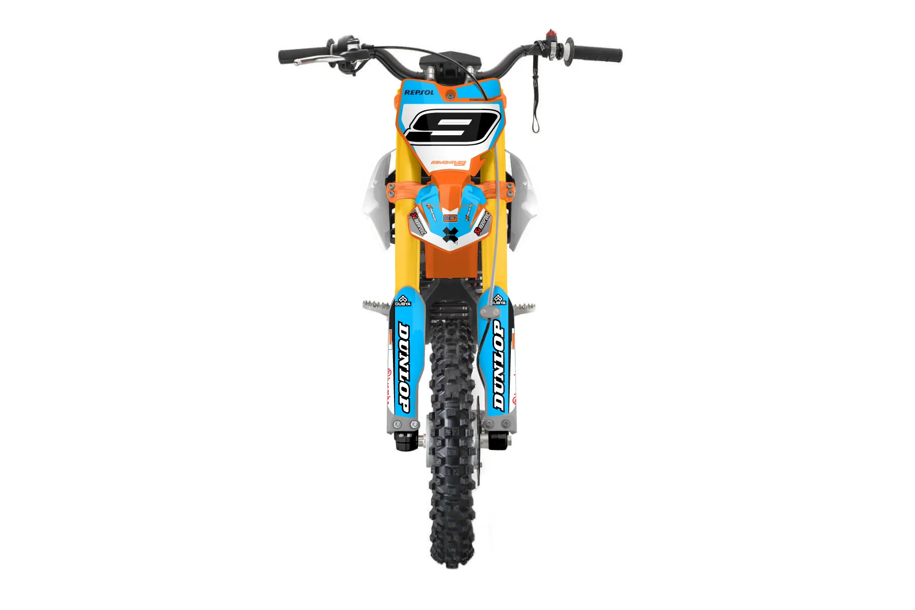 «Radim7» — готовый комплект графики серии Flow для KTM MX Graphic Kit KTM SX-E 5 2019. В комплекте: графика на бак и боковые облицовки, крылья (переднее и заднее), передний щиток, номерные таблички, защита вилки. Материал: ПВХ-винил 80 мкр с холодной ламинацией 300 мкр, общая толщина 380 мкр; покрытие глянцевое или матовое на выбор. Устойчив к UV-излучению, воде, бензину и мойке высокого давления. Клей акриловый на сольвентной основе — постоянный, для гибких пластиков. На простых поверхностях монтируется без нагрева; для сложных изгибов рекомендуем фен. Этот пресет можно заказать как есть или взять за основу в конструкторе: поменять цвета, добавить стартовый номер и свой бренд. Производство — 3–5 рабочих дней, доставка по России СДЭКом или Почтой, по СНГ — курьерскими службами.