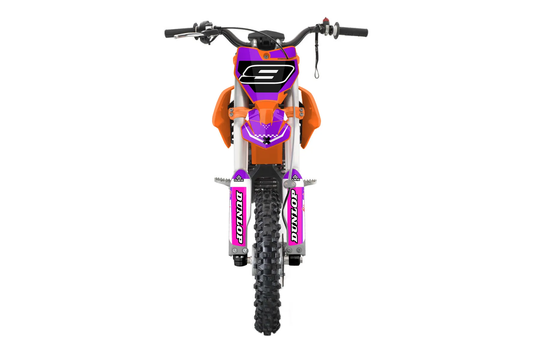 «E5» — готовый комплект графики серии Staple для KTM MX Graphic Kit KTM SX-E 5 2019. В комплекте: графика на бак и боковые облицовки, крылья (переднее и заднее), передний щиток, номерные таблички, защита вилки. Материал: ПВХ-винил 80 мкр с холодной ламинацией 300 мкр, общая толщина 380 мкр; покрытие глянцевое или матовое на выбор. Устойчив к UV-излучению, воде, бензину и мойке высокого давления. Клей акриловый на сольвентной основе — постоянный, для гибких пластиков. На простых поверхностях монтируется без нагрева; для сложных изгибов рекомендуем фен. Этот пресет можно заказать как есть или взять за основу в конструкторе: поменять цвета, добавить стартовый номер и свой бренд. Производство — 3–5 рабочих дней, доставка по России СДЭКом или Почтой, по СНГ — курьерскими службами.