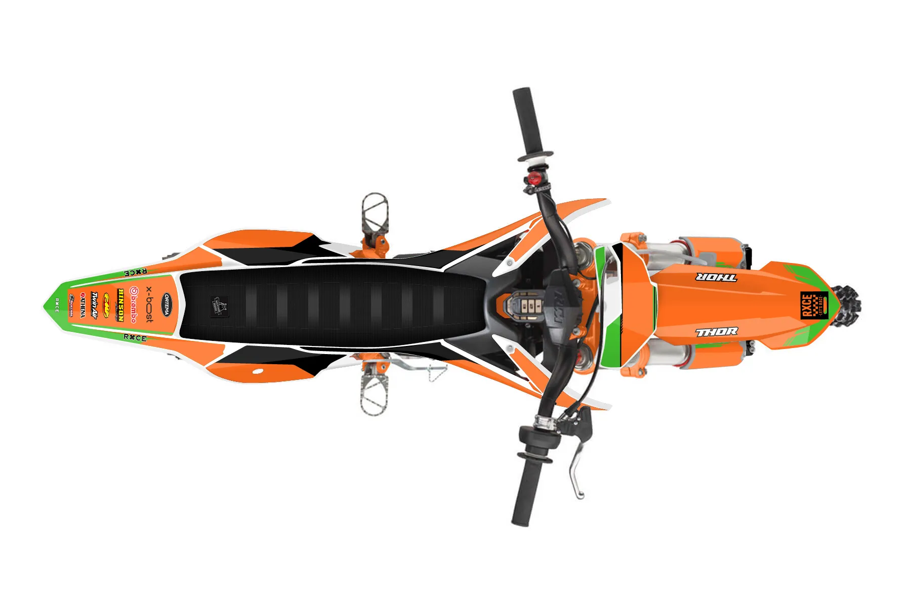 «V6» — готовый комплект графики серии Untucked для KTM MX Graphic Kit KTM SX-E 5 2019. В комплекте: графика на бак и боковые облицовки, крылья (переднее и заднее), передний щиток, номерные таблички, защита вилки. Материал: ПВХ-винил 80 мкр с холодной ламинацией 300 мкр, общая толщина 380 мкр; покрытие глянцевое или матовое на выбор. Устойчив к UV-излучению, воде, бензину и мойке высокого давления. Клей акриловый на сольвентной основе — постоянный, для гибких пластиков. На простых поверхностях монтируется без нагрева; для сложных изгибов рекомендуем фен. Этот пресет можно заказать как есть или взять за основу в конструкторе: поменять цвета, добавить стартовый номер и свой бренд. Производство — 3–5 рабочих дней, доставка по России СДЭКом или Почтой, по СНГ — курьерскими службами.