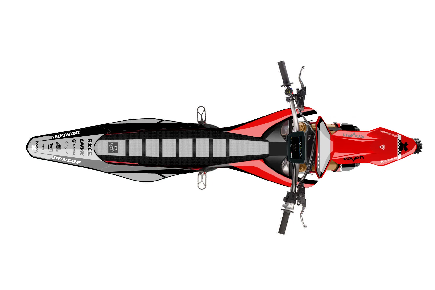 «CustomDesign» — готовый комплект графики серии Staple для Stark MX Graphic Kit Stark Varg 2024. В комплекте: графика на бак и боковые облицовки, крылья (переднее и заднее), передний щиток, номерные таблички, защита вилки. Материал: ПВХ-винил 80 мкр с холодной ламинацией 300 мкр, общая толщина 380 мкр; покрытие глянцевое или матовое на выбор. Устойчив к UV-излучению, воде, бензину и мойке высокого давления. Клей акриловый на сольвентной основе — постоянный, для гибких пластиков. На простых поверхностях монтируется без нагрева; для сложных изгибов рекомендуем фен. Этот пресет можно заказать как есть или взять за основу в конструкторе: поменять цвета, добавить стартовый номер и свой бренд. Производство — 3–5 рабочих дней, доставка по России СДЭКом или Почтой, по СНГ — курьерскими службами.