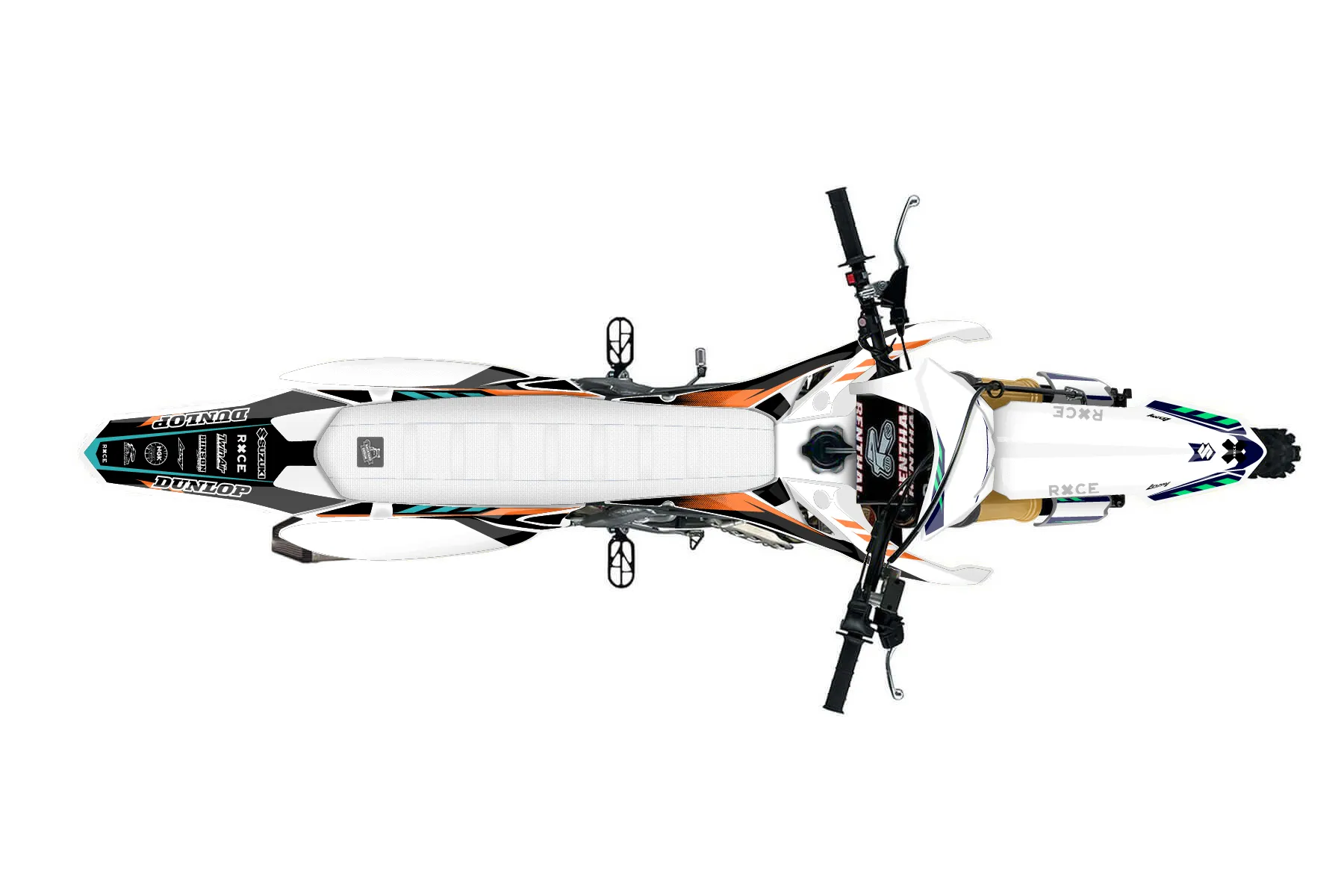 «450 design 1» — готовый комплект графики серии Maverick для Suzuki MX Graphic Kit Suzuki RMZ 450 2018. В комплекте: графика на бак и боковые облицовки, крылья (переднее и заднее), передний щиток, номерные таблички, защита вилки. Материал: ПВХ-винил 80 мкр с холодной ламинацией 300 мкр, общая толщина 380 мкр; покрытие глянцевое или матовое на выбор. Устойчив к UV-излучению, воде, бензину и мойке высокого давления. Клей акриловый на сольвентной основе — постоянный, для гибких пластиков. На простых поверхностях монтируется без нагрева; для сложных изгибов рекомендуем фен. Этот пресет можно заказать как есть или взять за основу в конструкторе: поменять цвета, добавить стартовый номер и свой бренд. Производство — 3–5 рабочих дней, доставка по России СДЭКом или Почтой, по СНГ — курьерскими службами.
