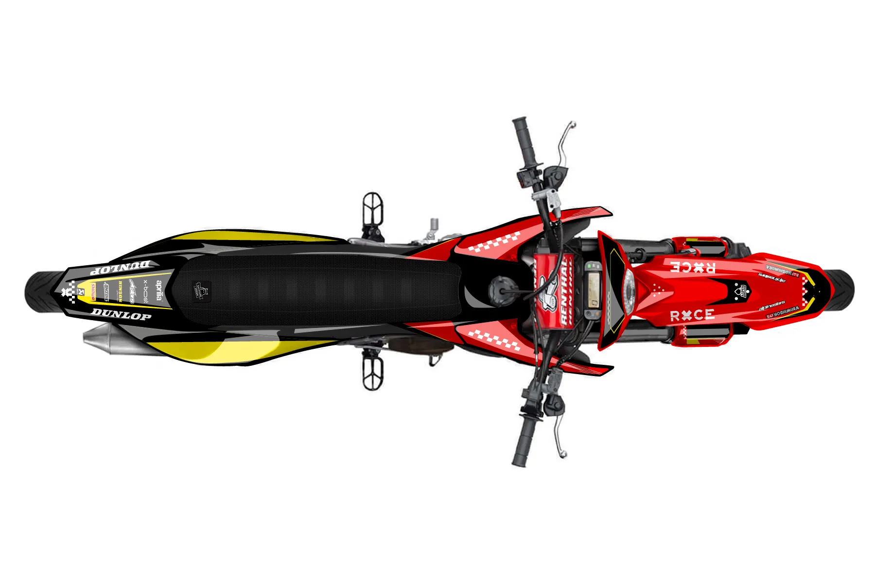 Как правильно наклеить графику«Data» — готовый комплект графики серии Staple для Aprilia MX Graphic Kit Aprilia SX 125 2018. В комплекте: графика на бак и боковые облицовки, крылья (переднее и заднее), передний щиток, номерные таблички, защита вилки. Материал: ПВХ-винил 80 мкр с холодной ламинацией 300 мкр, общая толщина 380 мкр; покрытие глянцевое или матовое на выбор. Устойчив к UV-излучению, воде, бензину и мойке высокого давления. Клей акриловый на сольвентной основе — постоянный, для гибких пластиков. На простых поверхностях монтируется без нагрева; для сложных изгибов рекомендуем фен. Этот пресет можно заказать как есть или взять за основу в конструкторе: поменять цвета, добавить стартовый номер и свой бренд. Производство — 3–5 рабочих дней, доставка по России СДЭКом или Почтой, по СНГ — курьерскими службами.
