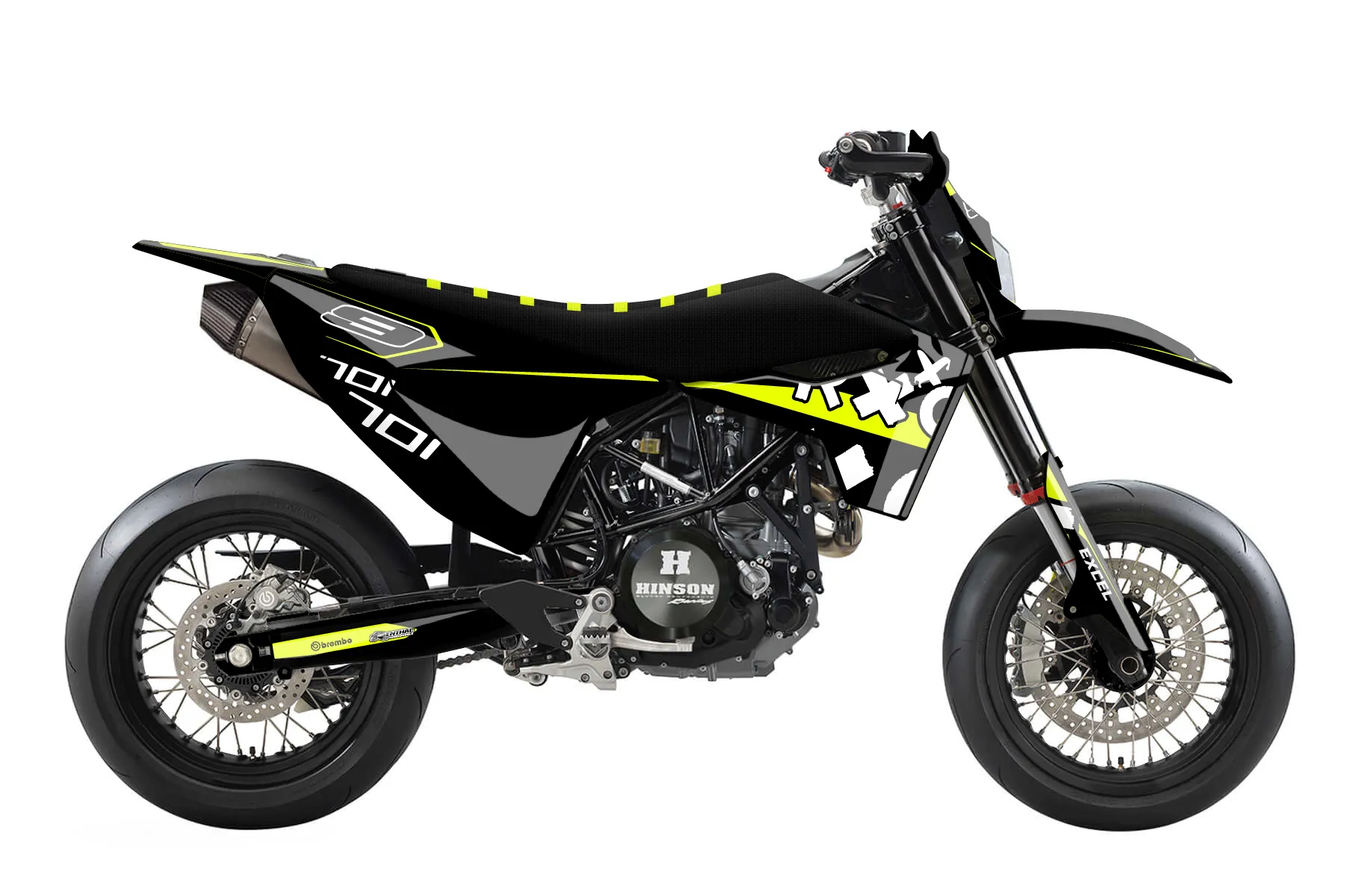 Как правильно наклеить графику«701» — готовый комплект графики серии Flow для Husqvarna Street Graphic Kit Husqvarna 701 2015. В комплекте: графика на бак и боковые облицовки, крылья (переднее и заднее), передний щиток, номерные таблички, защита вилки. Материал: ПВХ-винил 80 мкр с холодной ламинацией 300 мкр, общая толщина 380 мкр; покрытие глянцевое или матовое на выбор. Устойчив к UV-излучению, воде, бензину и мойке высокого давления. Клей акриловый на сольвентной основе — постоянный, для гибких пластиков. На простых поверхностях монтируется без нагрева; для сложных изгибов рекомендуем фен. Этот пресет можно заказать как есть или взять за основу в конструкторе: поменять цвета, добавить стартовый номер и свой бренд. Производство — 3–5 рабочих дней, доставка по России СДЭКом или Почтой, по СНГ — курьерскими службами.