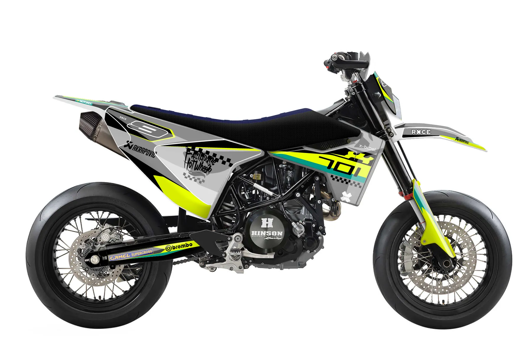 Как правильно наклеить графику«701 final draft» — готовый комплект графики серии Flow для Husqvarna Street Graphic Kit Husqvarna 701 2015. В комплекте: графика на бак и боковые облицовки, крылья (переднее и заднее), передний щиток, номерные таблички, защита вилки. Материал: ПВХ-винил 80 мкр с холодной ламинацией 300 мкр, общая толщина 380 мкр; покрытие глянцевое или матовое на выбор. Устойчив к UV-излучению, воде, бензину и мойке высокого давления. Клей акриловый на сольвентной основе — постоянный, для гибких пластиков. На простых поверхностях монтируется без нагрева; для сложных изгибов рекомендуем фен. Этот пресет можно заказать как есть или взять за основу в конструкторе: поменять цвета, добавить стартовый номер и свой бренд. Производство — 3–5 рабочих дней, доставка по России СДЭКом или Почтой, по СНГ — курьерскими службами.