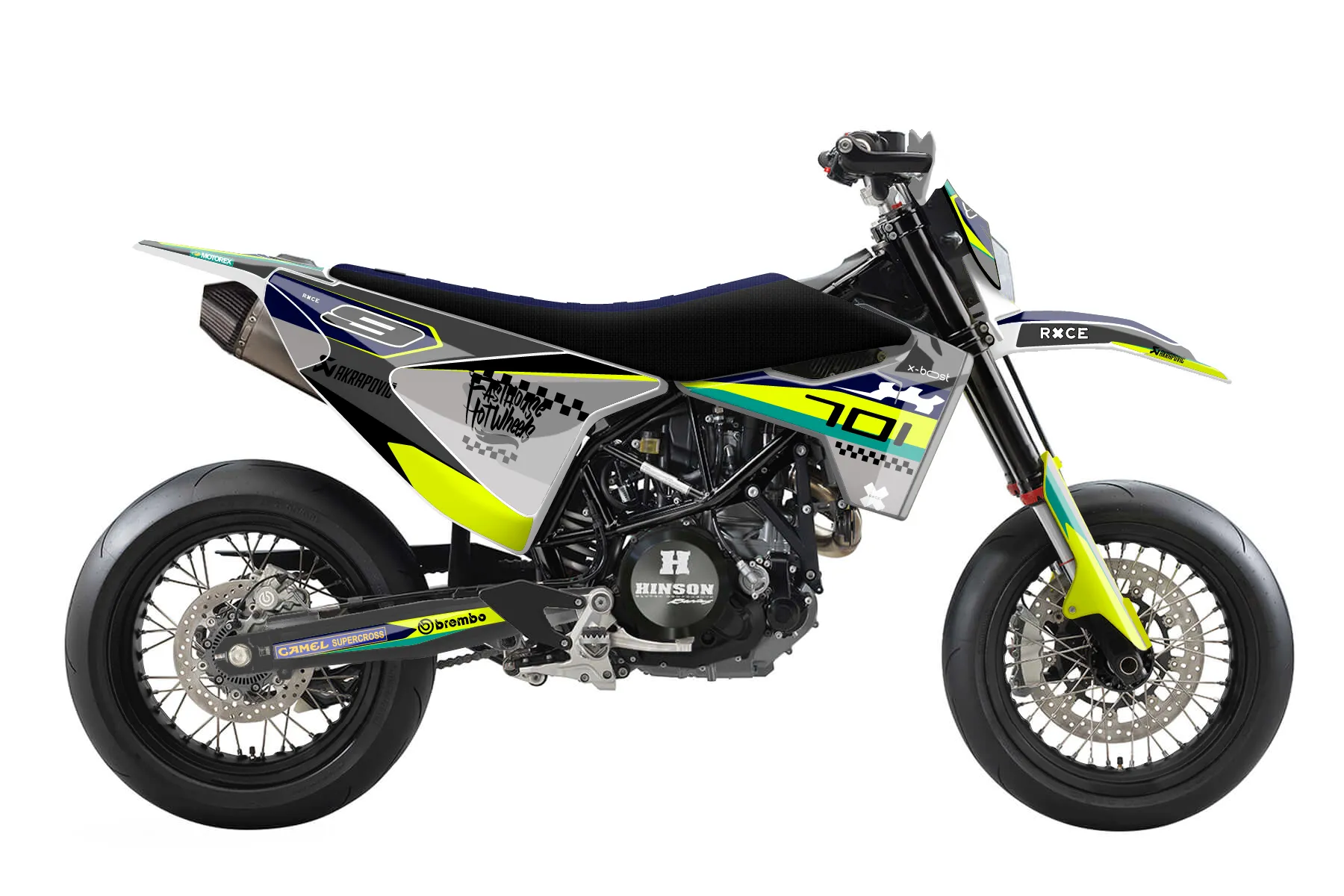 Как правильно наклеить графику«colors tweak final » — готовый комплект графики серии Flow для Husqvarna Street Graphic Kit Husqvarna 701 2015. В комплекте: графика на бак и боковые облицовки, крылья (переднее и заднее), передний щиток, номерные таблички, защита вилки. Материал: ПВХ-винил 80 мкр с холодной ламинацией 300 мкр, общая толщина 380 мкр; покрытие глянцевое или матовое на выбор. Устойчив к UV-излучению, воде, бензину и мойке высокого давления. Клей акриловый на сольвентной основе — постоянный, для гибких пластиков. На простых поверхностях монтируется без нагрева; для сложных изгибов рекомендуем фен. Этот пресет можно заказать как есть или взять за основу в конструкторе: поменять цвета, добавить стартовый номер и свой бренд. Производство — 3–5 рабочих дней, доставка по России СДЭКом или Почтой, по СНГ — курьерскими службами.