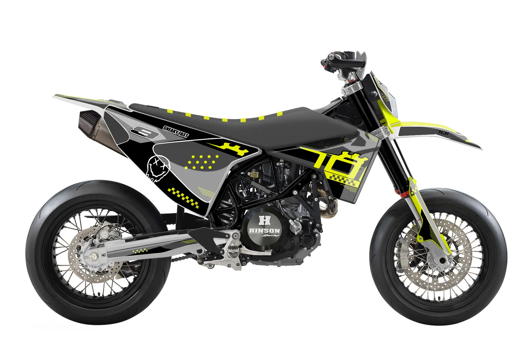 Как правильно наклеить графику«701 GREYSCALE YELLOW ACCENT» — готовый комплект графики серии Staple для Husqvarna Street Graphic Kit Husqvarna 701 2015. В комплекте: графика на бак и боковые облицовки, крылья (переднее и заднее), передний щиток, номерные таблички, защита вилки. Материал: ПВХ-винил 80 мкр с холодной ламинацией 300 мкр, общая толщина 380 мкр; покрытие глянцевое или матовое на выбор. Устойчив к UV-излучению, воде, бензину и мойке высокого давления. Клей акриловый на сольвентной основе — постоянный, для гибких пластиков. На простых поверхностях монтируется без нагрева; для сложных изгибов рекомендуем фен. Этот пресет можно заказать как есть или взять за основу в конструкторе: поменять цвета, добавить стартовый номер и свой бренд. Производство — 3–5 рабочих дней, доставка по России СДЭКом или Почтой, по СНГ — курьерскими службами.