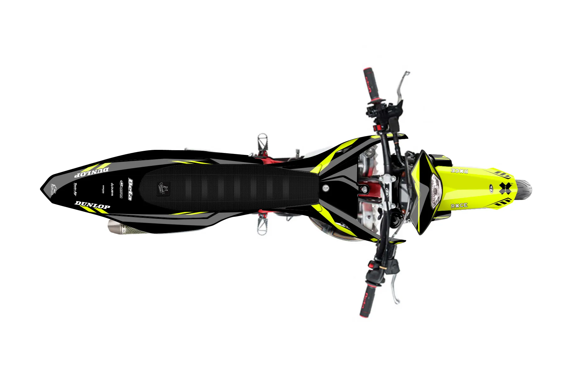 «Vivid Neon» — готовый комплект графики серии Maverick для Beta Enduro Graphic Kit Beta RR 300 (Kopie) (Kopie) 2011. В комплекте: графика на бак и боковые облицовки, крылья (переднее и заднее), передний щиток, номерные таблички, защита вилки. Материал: ПВХ-винил 80 мкр с холодной ламинацией 300 мкр, общая толщина 380 мкр; покрытие глянцевое или матовое на выбор. Устойчив к UV-излучению, воде, бензину и мойке высокого давления. Клей акриловый на сольвентной основе — постоянный, для гибких пластиков. На простых поверхностях монтируется без нагрева; для сложных изгибов рекомендуем фен. Этот пресет можно заказать как есть или взять за основу в конструкторе: поменять цвета, добавить стартовый номер и свой бренд. Производство — 3–5 рабочих дней, доставка по России СДЭКом или Почтой, по СНГ — курьерскими службами.