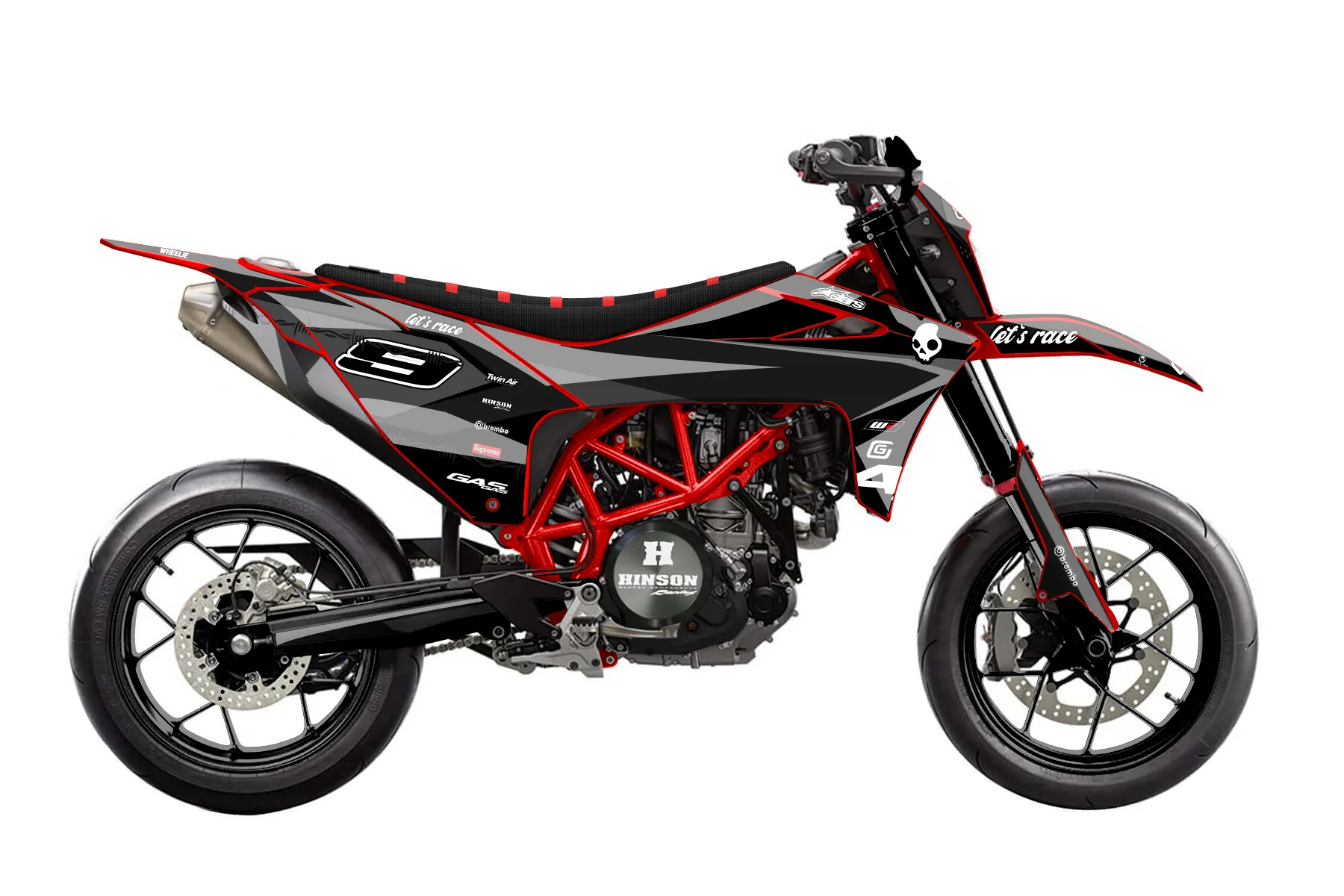 «GasGas 700 Yogurt x RedBull done» — готовый комплект графики серии Staple для GasGas Supermoto Dekor GasGas 700 2023. В комплекте: графика на бак и боковые облицовки, крылья (переднее и заднее), передний щиток, номерные таблички, защита вилки. Материал: ПВХ-винил 80 мкр с холодной ламинацией 300 мкр, общая толщина 380 мкр; покрытие глянцевое или матовое на выбор. Устойчив к UV-излучению, воде, бензину и мойке высокого давления. Клей акриловый на сольвентной основе — постоянный, для гибких пластиков. На простых поверхностях монтируется без нагрева; для сложных изгибов рекомендуем фен. Этот пресет можно заказать как есть или взять за основу в конструкторе: поменять цвета, добавить стартовый номер и свой бренд. Производство — 3–5 рабочих дней, доставка по России СДЭКом или Почтой, по СНГ — курьерскими службами.