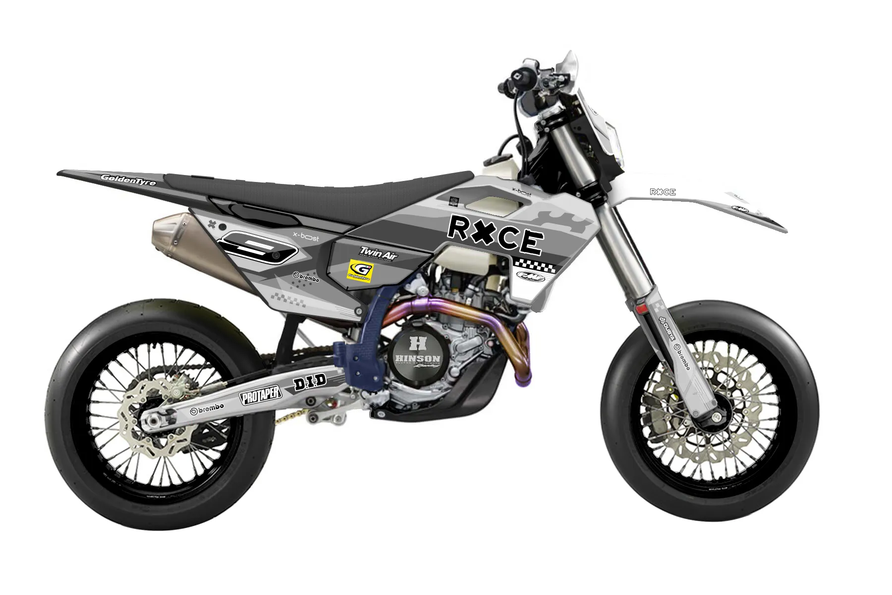 «CustomDesign» — готовый комплект графики серии Staple для Husqvarna Supermoto Graphic Kit Husqvarna FE 501 2024. В комплекте: графика на бак и боковые облицовки, крылья (переднее и заднее), передний щиток, номерные таблички, защита вилки. Материал: ПВХ-винил 80 мкр с холодной ламинацией 300 мкр, общая толщина 380 мкр; покрытие глянцевое или матовое на выбор. Устойчив к UV-излучению, воде, бензину и мойке высокого давления. Клей акриловый на сольвентной основе — постоянный, для гибких пластиков. На простых поверхностях монтируется без нагрева; для сложных изгибов рекомендуем фен. Этот пресет можно заказать как есть или взять за основу в конструкторе: поменять цвета, добавить стартовый номер и свой бренд. Производство — 3–5 рабочих дней, доставка по России СДЭКом или Почтой, по СНГ — курьерскими службами.
