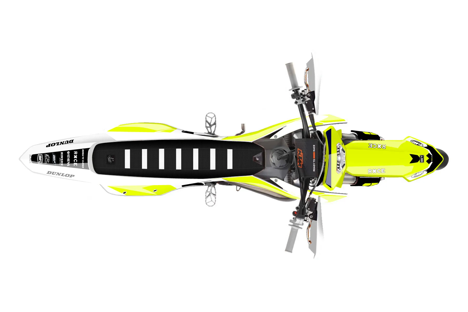 «Rise Fluo» — готовый комплект графики серии Flow для KTM Supermoto Graphic Kit KTM EXC 150 2024. В комплекте: графика на бак и боковые облицовки, крылья (переднее и заднее), передний щиток, номерные таблички, защита вилки. Материал: ПВХ-винил 80 мкр с холодной ламинацией 300 мкр, общая толщина 380 мкр; покрытие глянцевое или матовое на выбор. Устойчив к UV-излучению, воде, бензину и мойке высокого давления. Клей акриловый на сольвентной основе — постоянный, для гибких пластиков. На простых поверхностях монтируется без нагрева; для сложных изгибов рекомендуем фен. Этот пресет можно заказать как есть или взять за основу в конструкторе: поменять цвета, добавить стартовый номер и свой бренд. Производство — 3–5 рабочих дней, доставка по России СДЭКом или Почтой, по СНГ — курьерскими службами.
