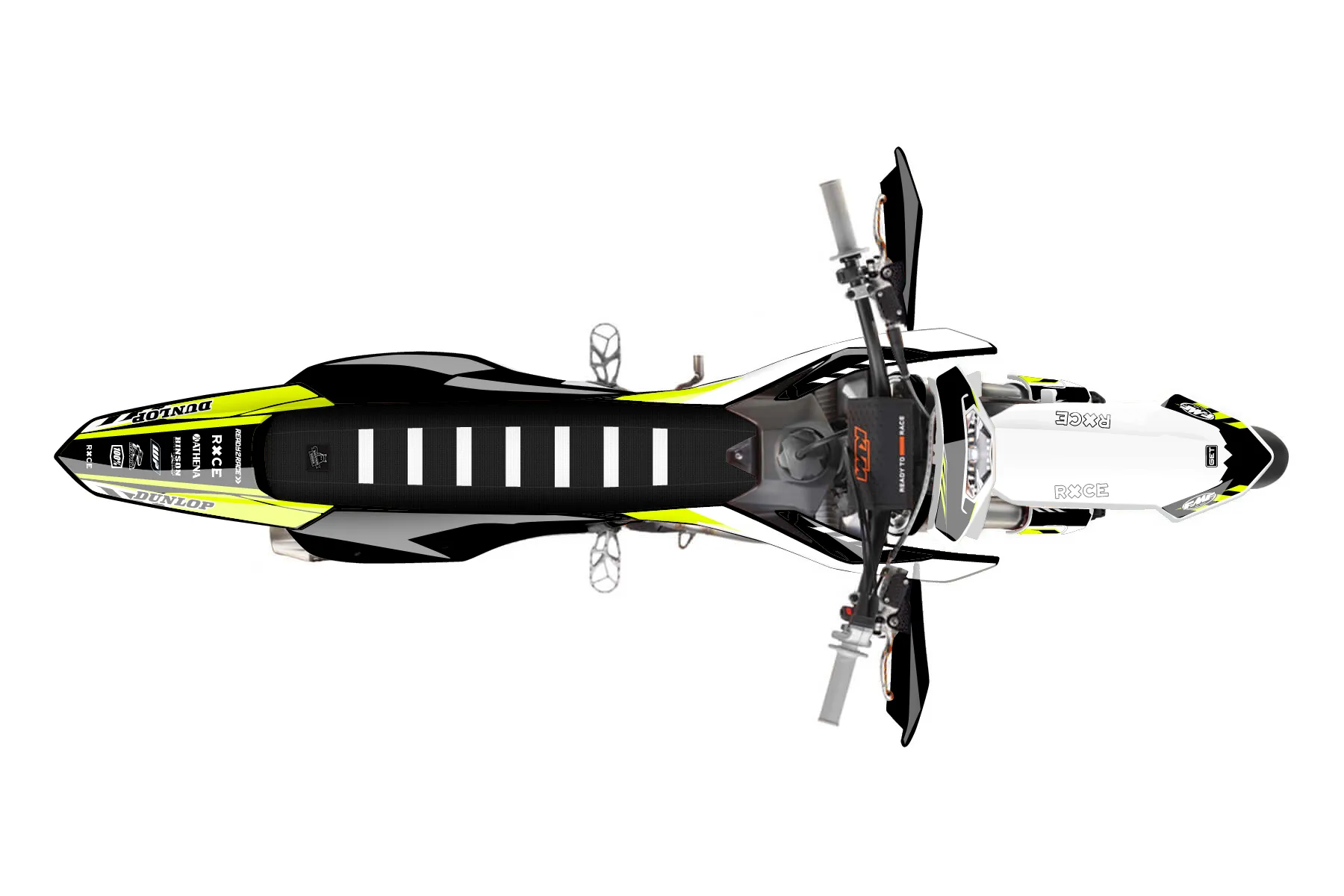 «Grip Neon» — готовый комплект графики серии Maverick для KTM Supermoto Graphic Kit KTM EXC-F 450 2024. В комплекте: графика на бак и боковые облицовки, крылья (переднее и заднее), передний щиток, номерные таблички, защита вилки. Материал: ПВХ-винил 80 мкр с холодной ламинацией 300 мкр, общая толщина 380 мкр; покрытие глянцевое или матовое на выбор. Устойчив к UV-излучению, воде, бензину и мойке высокого давления. Клей акриловый на сольвентной основе — постоянный, для гибких пластиков. На простых поверхностях монтируется без нагрева; для сложных изгибов рекомендуем фен. Этот пресет можно заказать как есть или взять за основу в конструкторе: поменять цвета, добавить стартовый номер и свой бренд. Производство — 3–5 рабочих дней, доставка по России СДЭКом или Почтой, по СНГ — курьерскими службами.