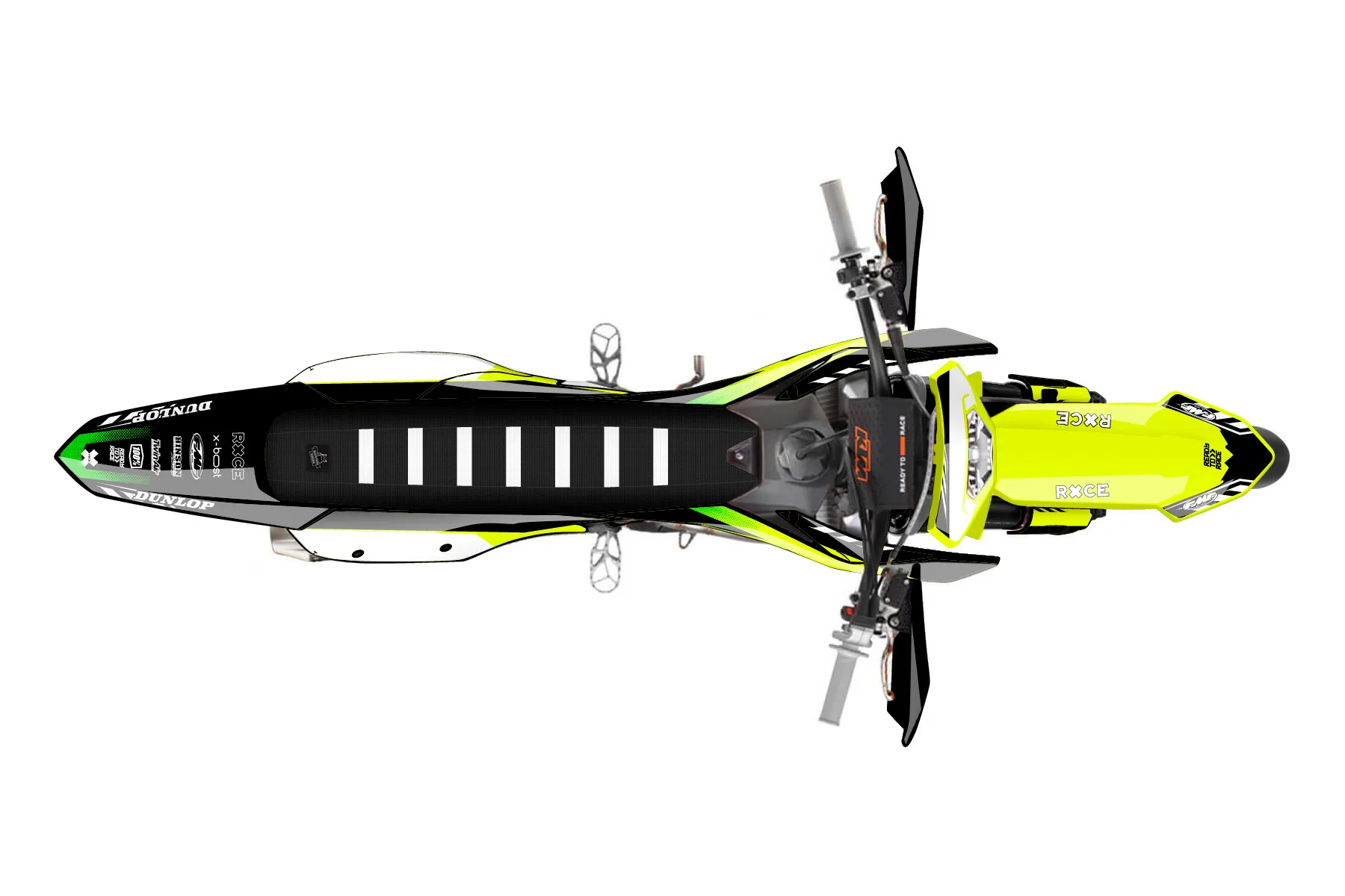 «Volt Neon» — готовый комплект графики серии Maverick для KTM Supermoto Graphic Kit KTM EXC-F 450 2024. В комплекте: графика на бак и боковые облицовки, крылья (переднее и заднее), передний щиток, номерные таблички, защита вилки. Материал: ПВХ-винил 80 мкр с холодной ламинацией 300 мкр, общая толщина 380 мкр; покрытие глянцевое или матовое на выбор. Устойчив к UV-излучению, воде, бензину и мойке высокого давления. Клей акриловый на сольвентной основе — постоянный, для гибких пластиков. На простых поверхностях монтируется без нагрева; для сложных изгибов рекомендуем фен. Этот пресет можно заказать как есть или взять за основу в конструкторе: поменять цвета, добавить стартовый номер и свой бренд. Производство — 3–5 рабочих дней, доставка по России СДЭКом или Почтой, по СНГ — курьерскими службами.