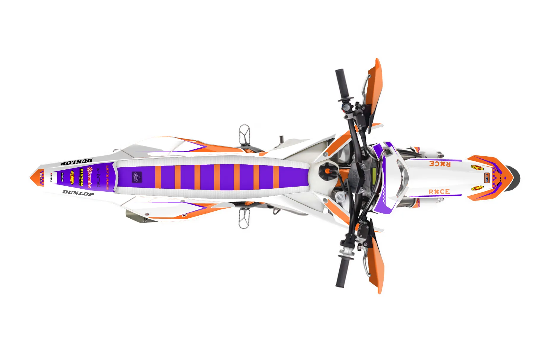 «Retro» — готовый комплект графики серии Staple для KTM Supermoto Graphic Kit KTM EXC-F 500 2017. В комплекте: графика на бак и боковые облицовки, крылья (переднее и заднее), передний щиток, номерные таблички, защита вилки. Материал: ПВХ-винил 80 мкр с холодной ламинацией 300 мкр, общая толщина 380 мкр; покрытие глянцевое или матовое на выбор. Устойчив к UV-излучению, воде, бензину и мойке высокого давления. Клей акриловый на сольвентной основе — постоянный, для гибких пластиков. На простых поверхностях монтируется без нагрева; для сложных изгибов рекомендуем фен. Этот пресет можно заказать как есть или взять за основу в конструкторе: поменять цвета, добавить стартовый номер и свой бренд. Производство — 3–5 рабочих дней, доставка по России СДЭКом или Почтой, по СНГ — курьерскими службами.